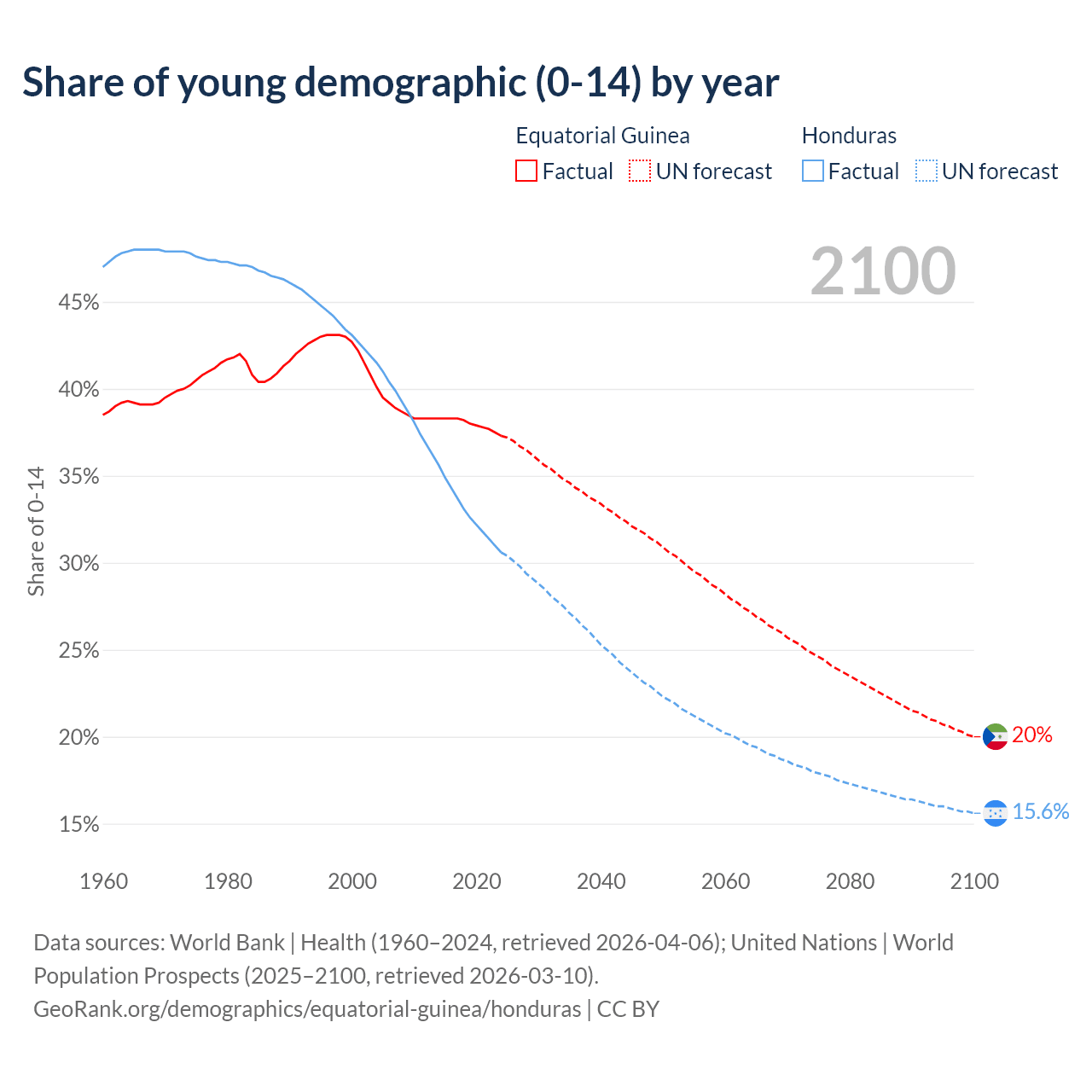 - The share of young demographic (0-15 years old) in Equatorial Guinea is 37.3% vs 30.6% in Honduras.