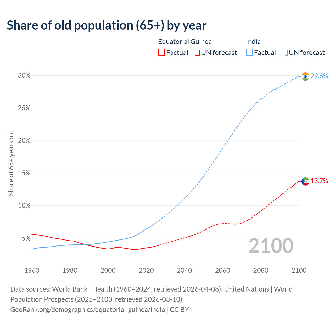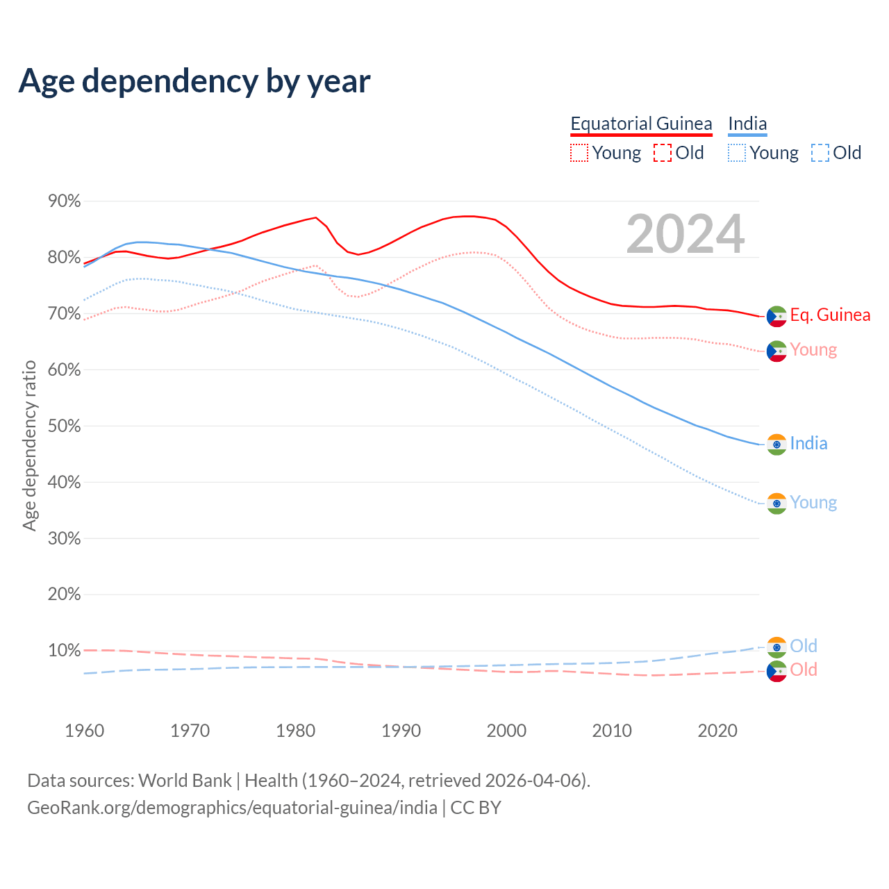 - The share of old-age demographic (65+) in Equatorial Guinea is 3.69% vs 7.15% in India.
