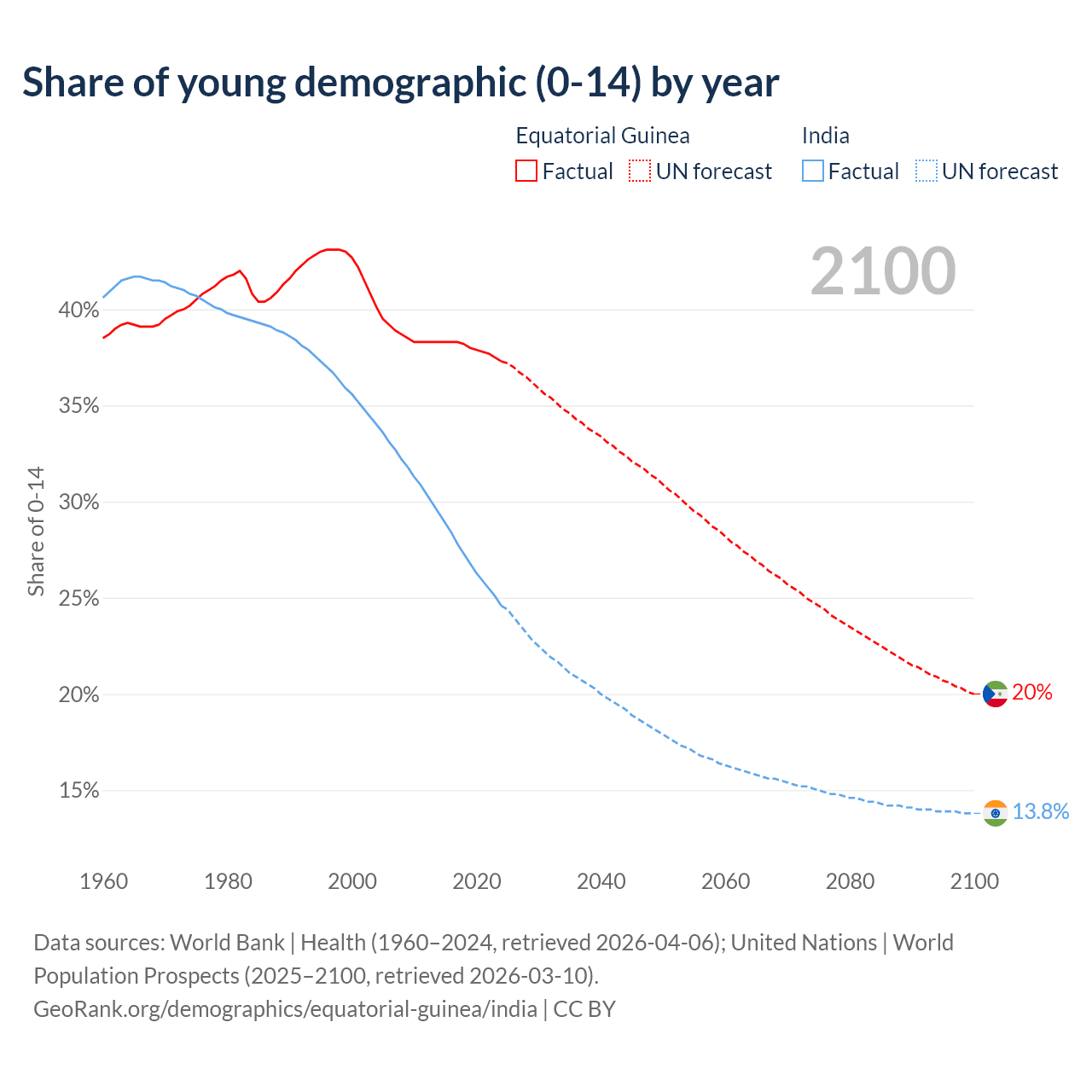 - The share of young demographic (0-15 years old) in Equatorial Guinea is 37.3% vs 24.6% in India.