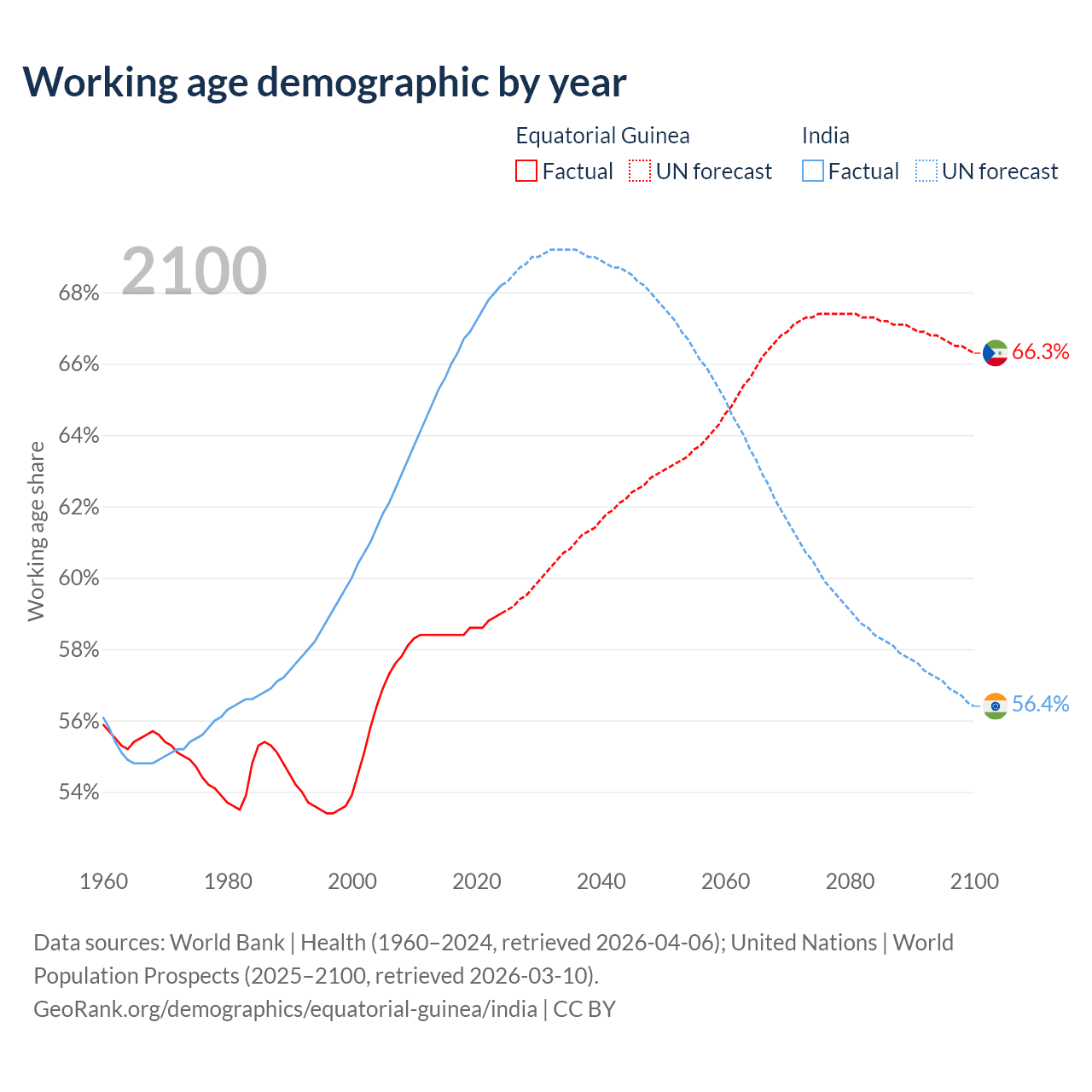 Median age Equatorial Guinea vs India, 1960-2100