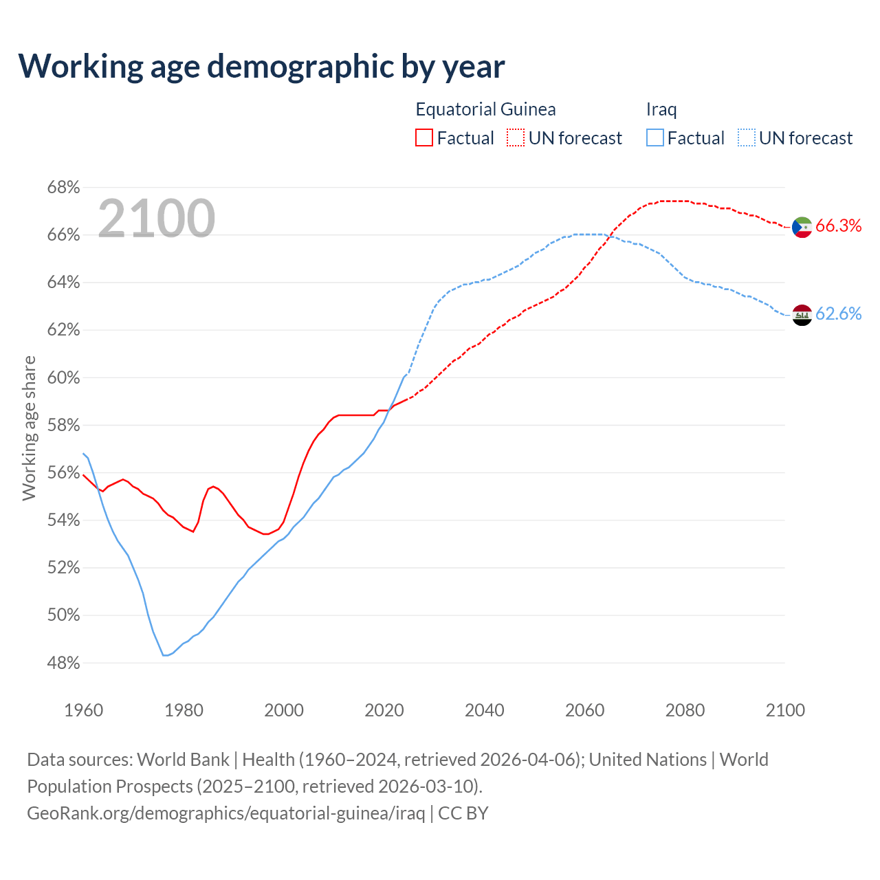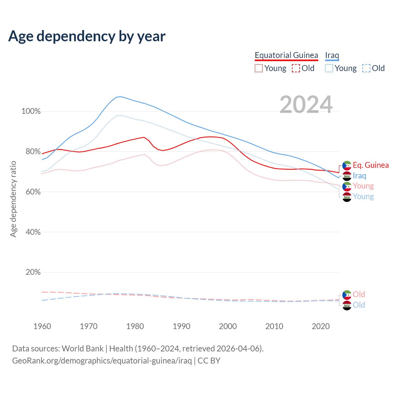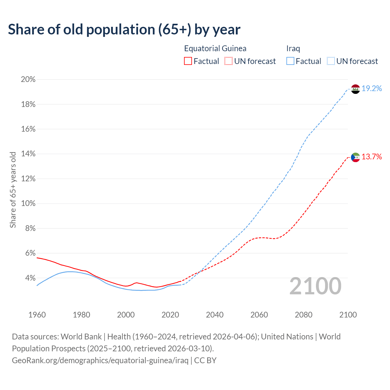 - The share of old-age demographic (65+) in Equatorial Guinea is 3.69% vs 3.41% in Iraq.
