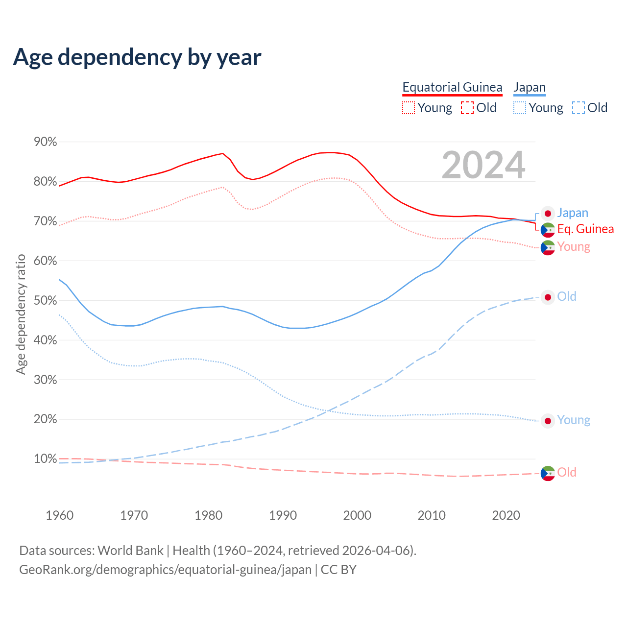 The share of older people aged 65 and over is 3.69% in Equatorial Guinea and 29.8% in Japan. Life expectancy in Equatorial Guinea compared to Japan .