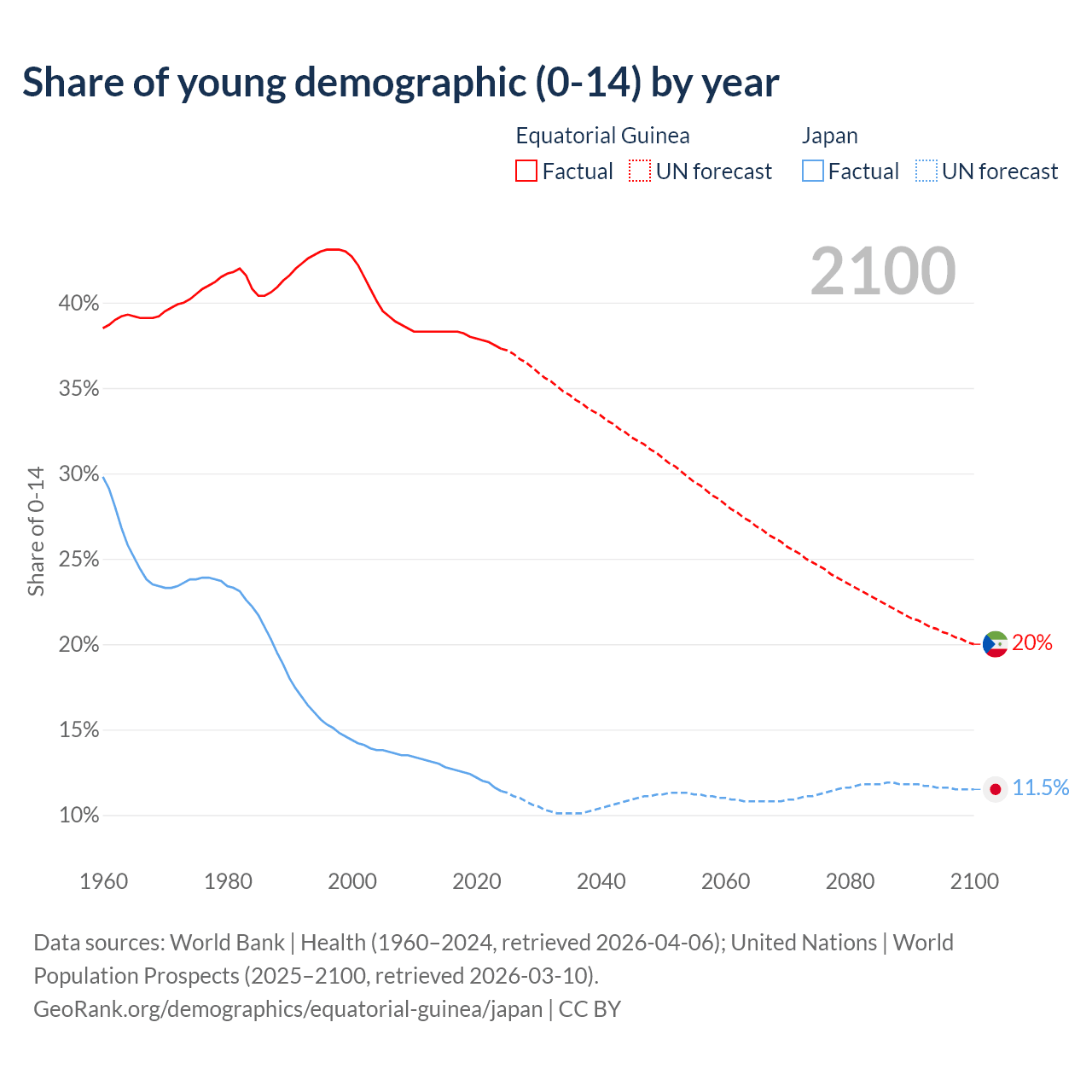 - The share of young demographic (0-15 years old) in Equatorial Guinea is 37.3% vs 11.4% in Japan.