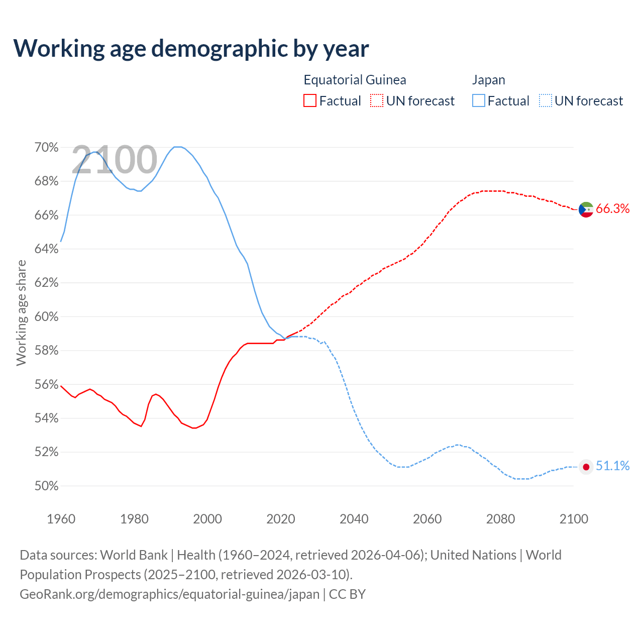 Median age Equatorial Guinea vs Japan, 1960-2100