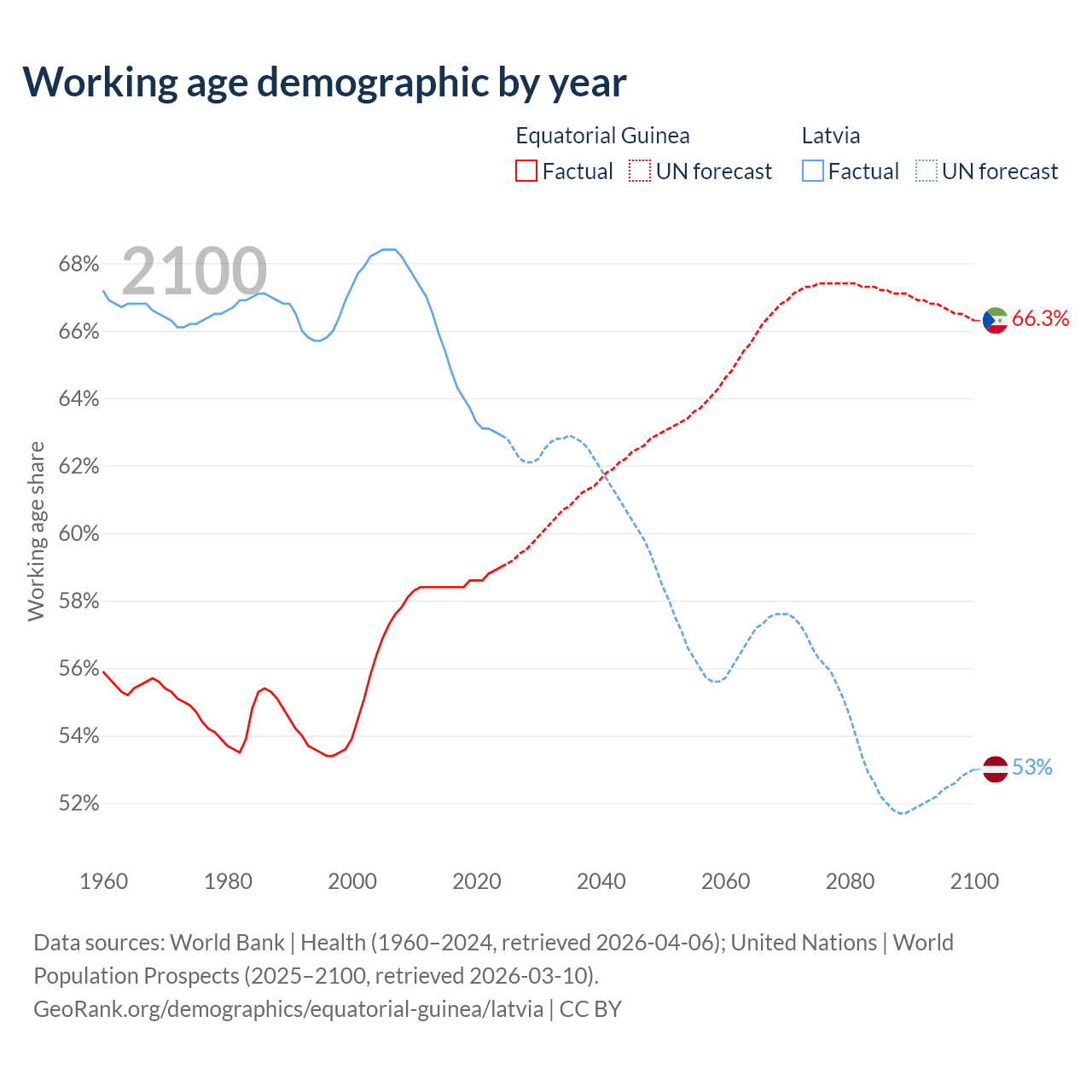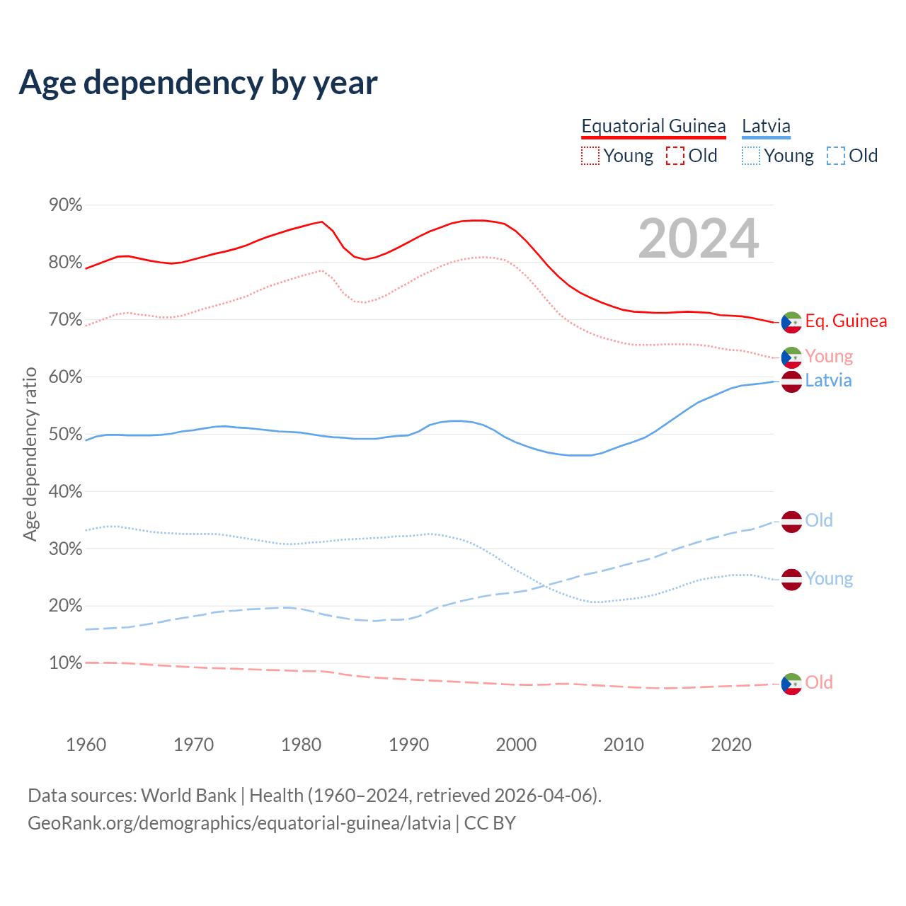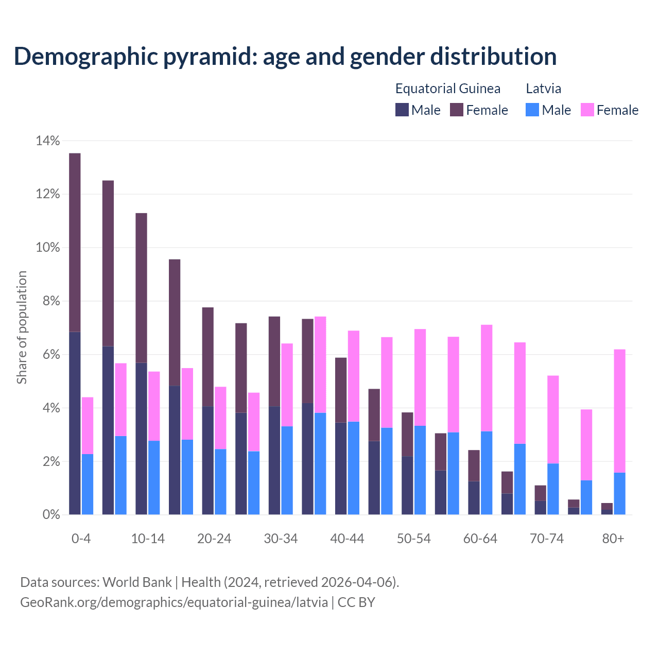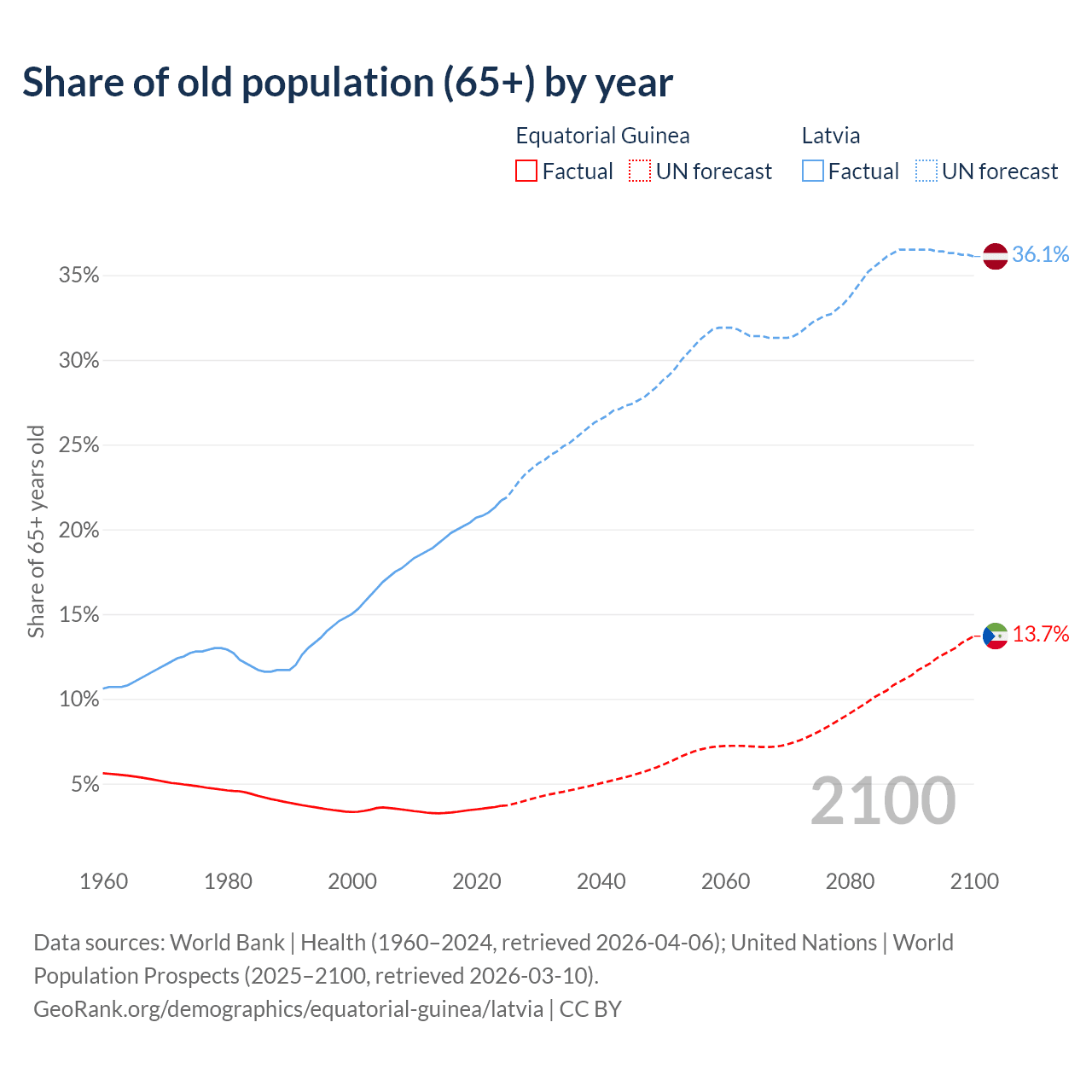 - The share of old-age demographic (65+) in Equatorial Guinea is 3.69% vs 21.7% in Latvia.