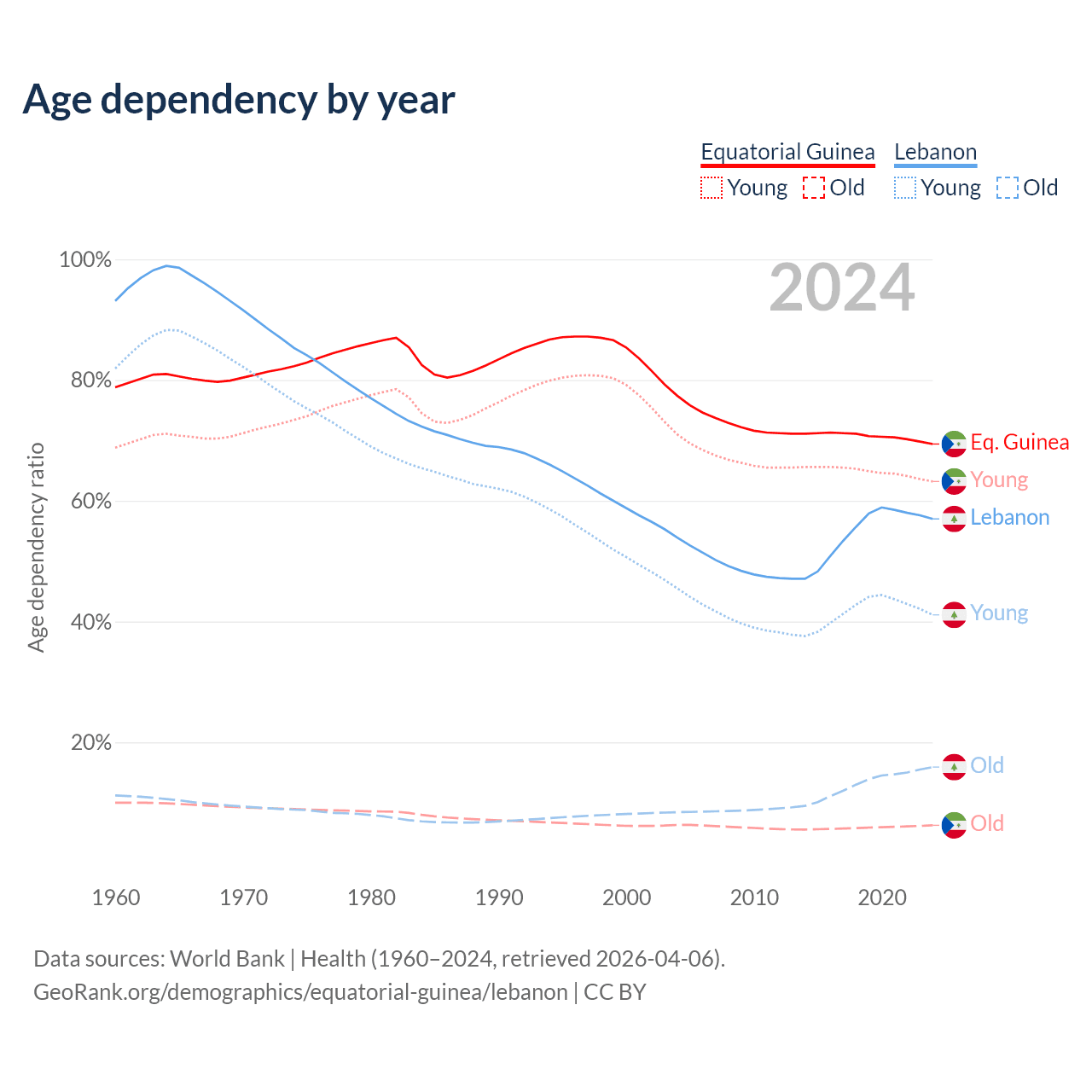 - The share of old-age demographic (65+) in Equatorial Guinea is 3.69% vs 10.1% in Lebanon.