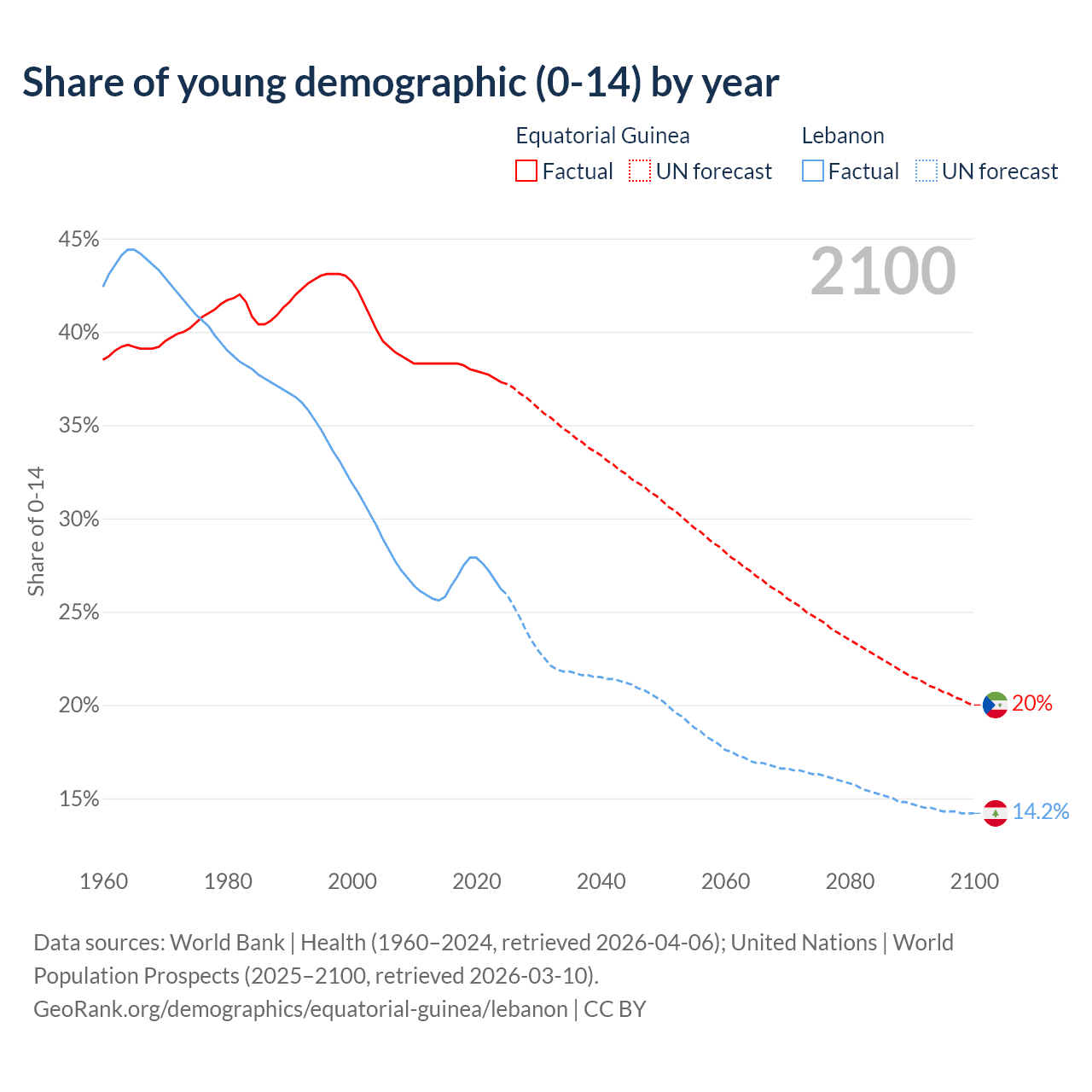 - The share of young demographic (0-15 years old) in Equatorial Guinea is 37.3% vs 26.2% in Lebanon.