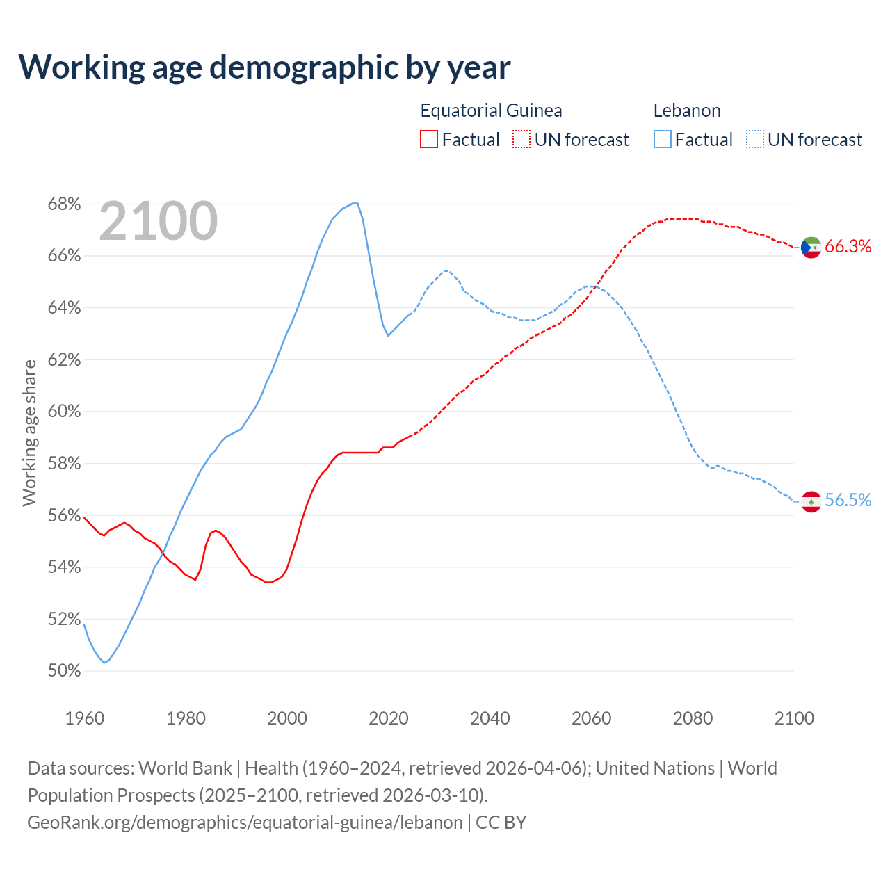 The share of older people aged 65 and over is 3.69% in Equatorial Guinea and 10.1% in Lebanon. Life expectancy in Equatorial Guinea compared to Lebanon .