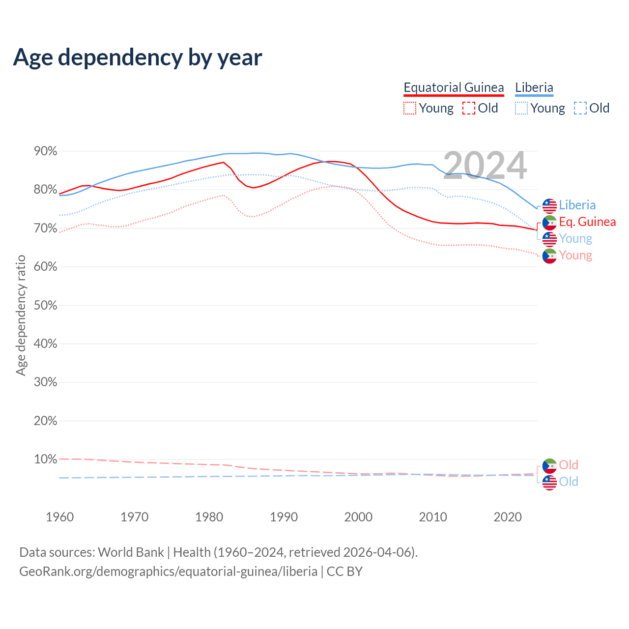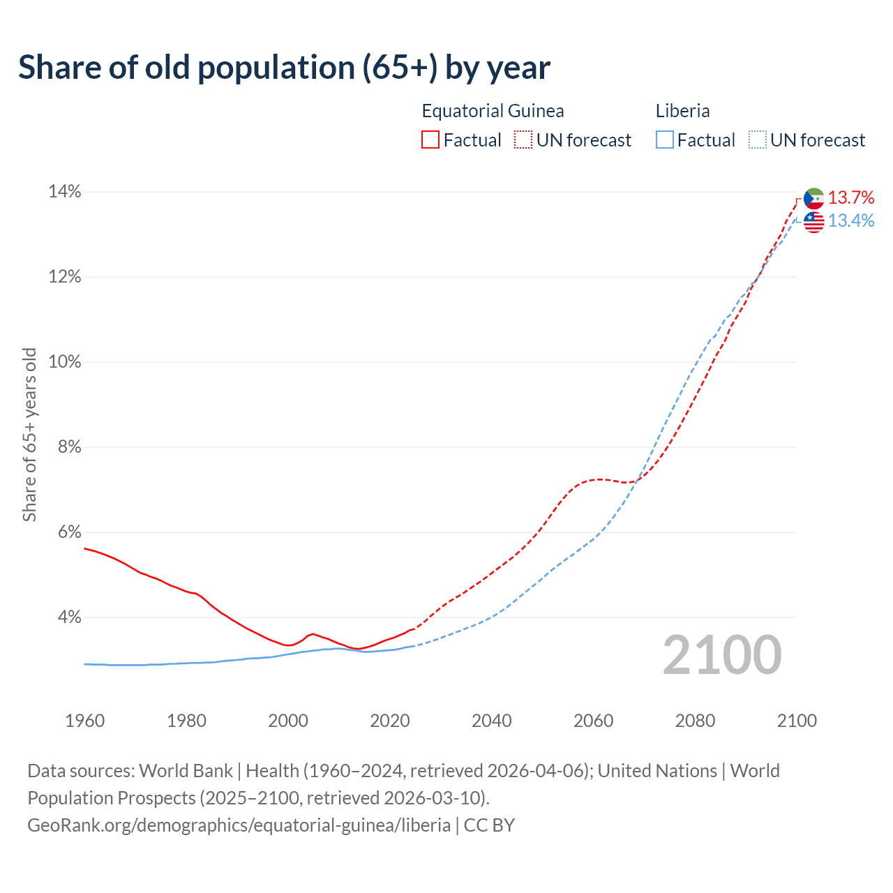- The share of old-age demographic (65+) in Equatorial Guinea is 3.69% vs 3.3% in Liberia.