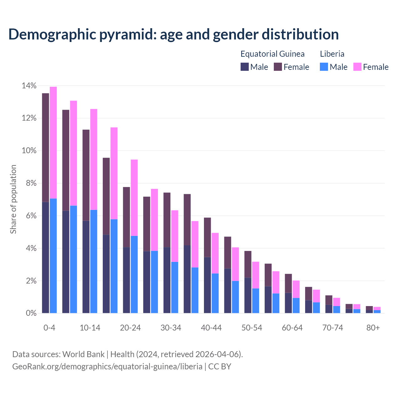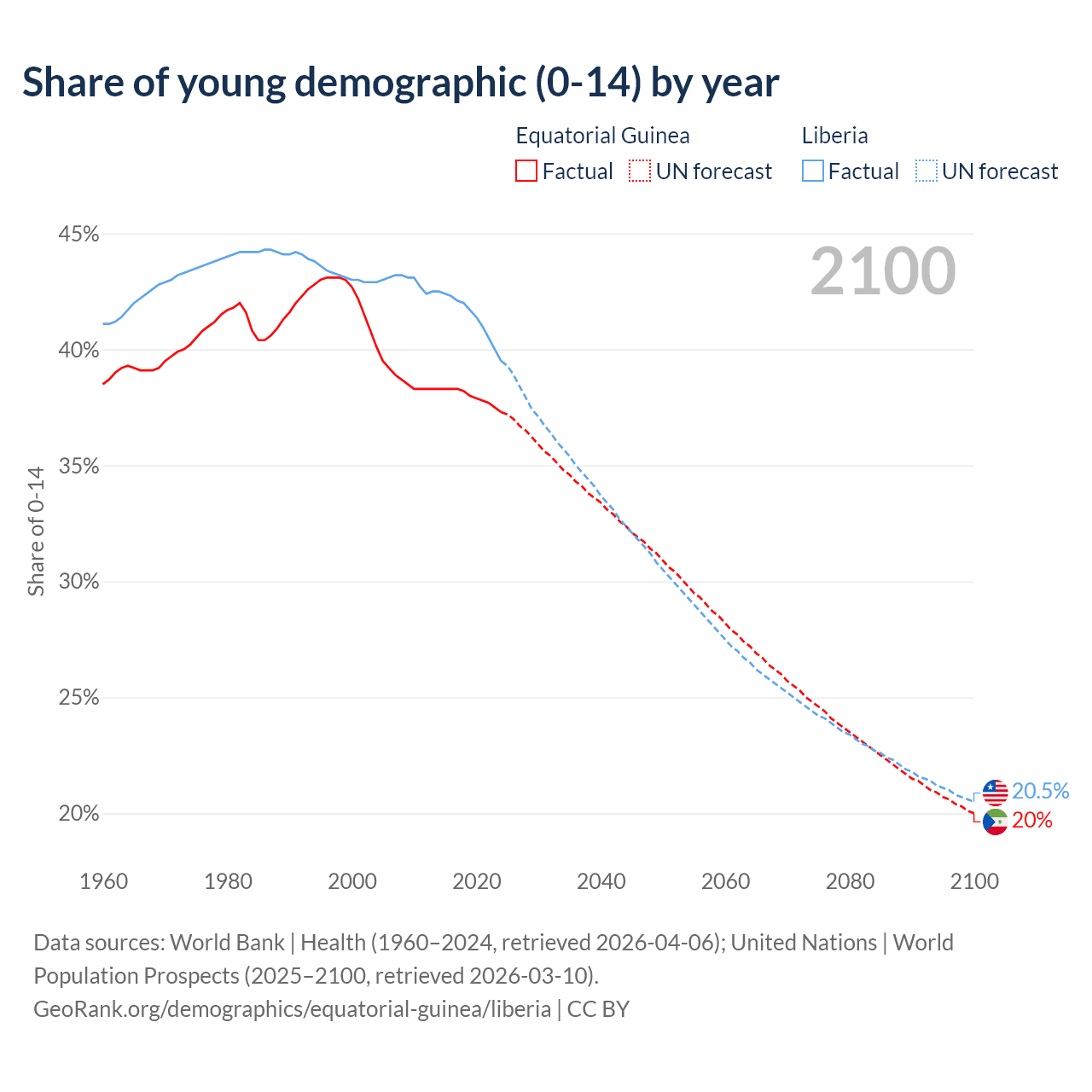 - The share of young demographic (0-15 years old) in Equatorial Guinea is 37.3% vs 39.5% in Liberia.