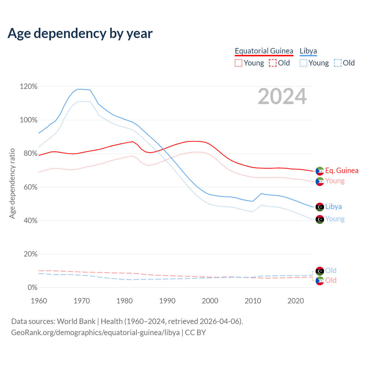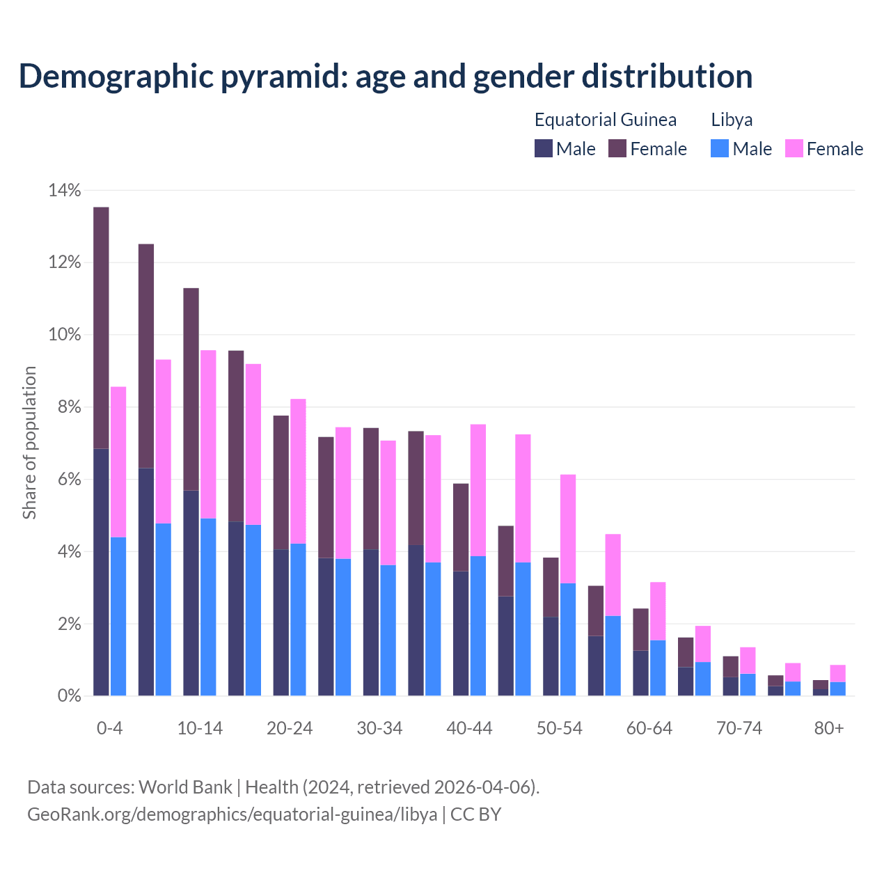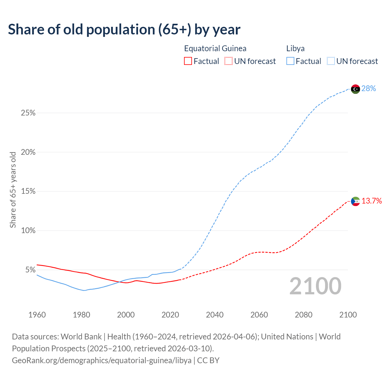 - The share of old-age demographic (65+) in Equatorial Guinea is 3.69% vs 5.02% in Libya.