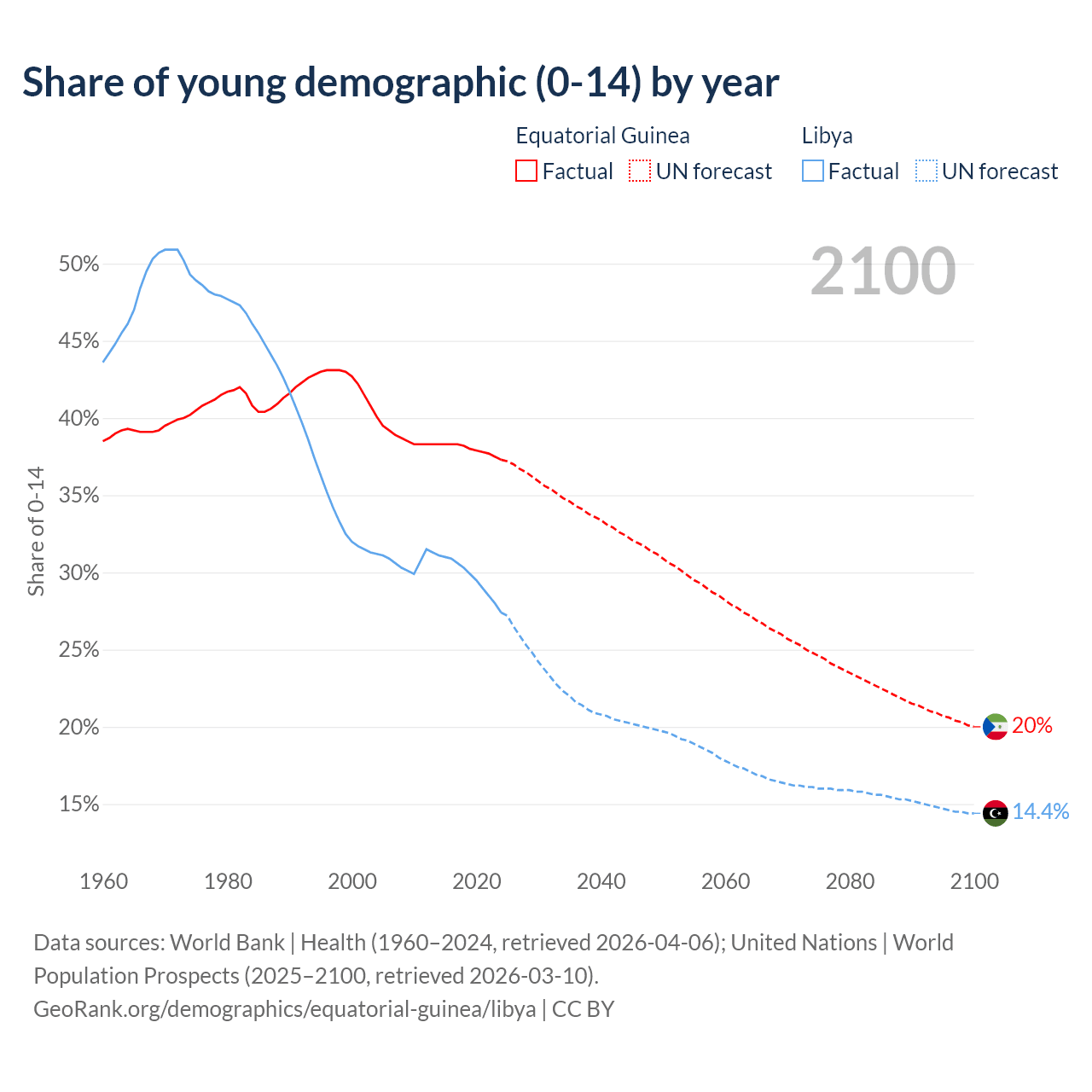- The share of young demographic (0-15 years old) in Equatorial Guinea is 37.3% vs 27.4% in Libya.