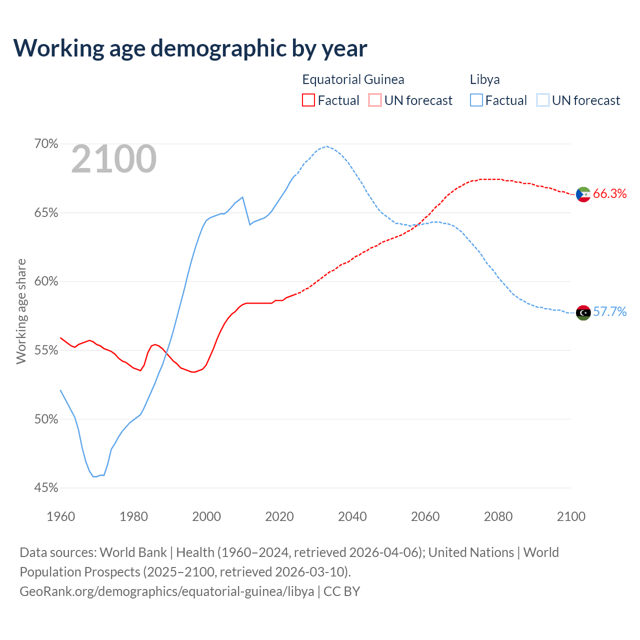 - Equatorial Guinea has 1.18M working age adults (aged 15-64) vs 5.11M in Libya.