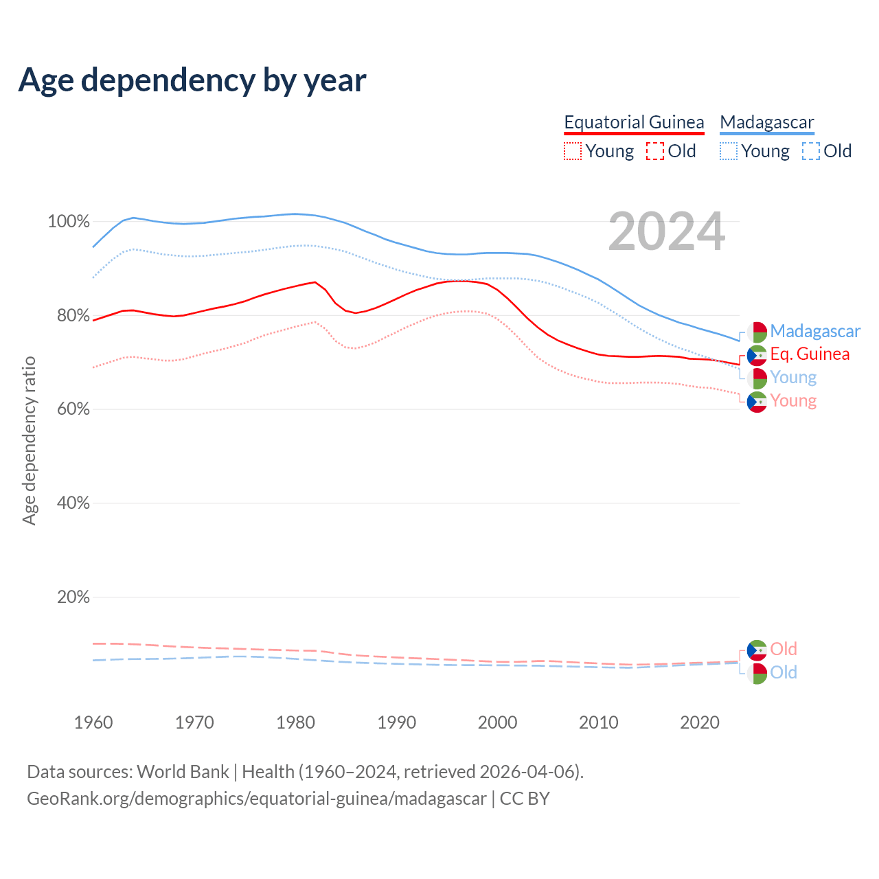 - The share of old-age demographic (65+) in Equatorial Guinea is 3.69% vs 3.41% in Madagascar.