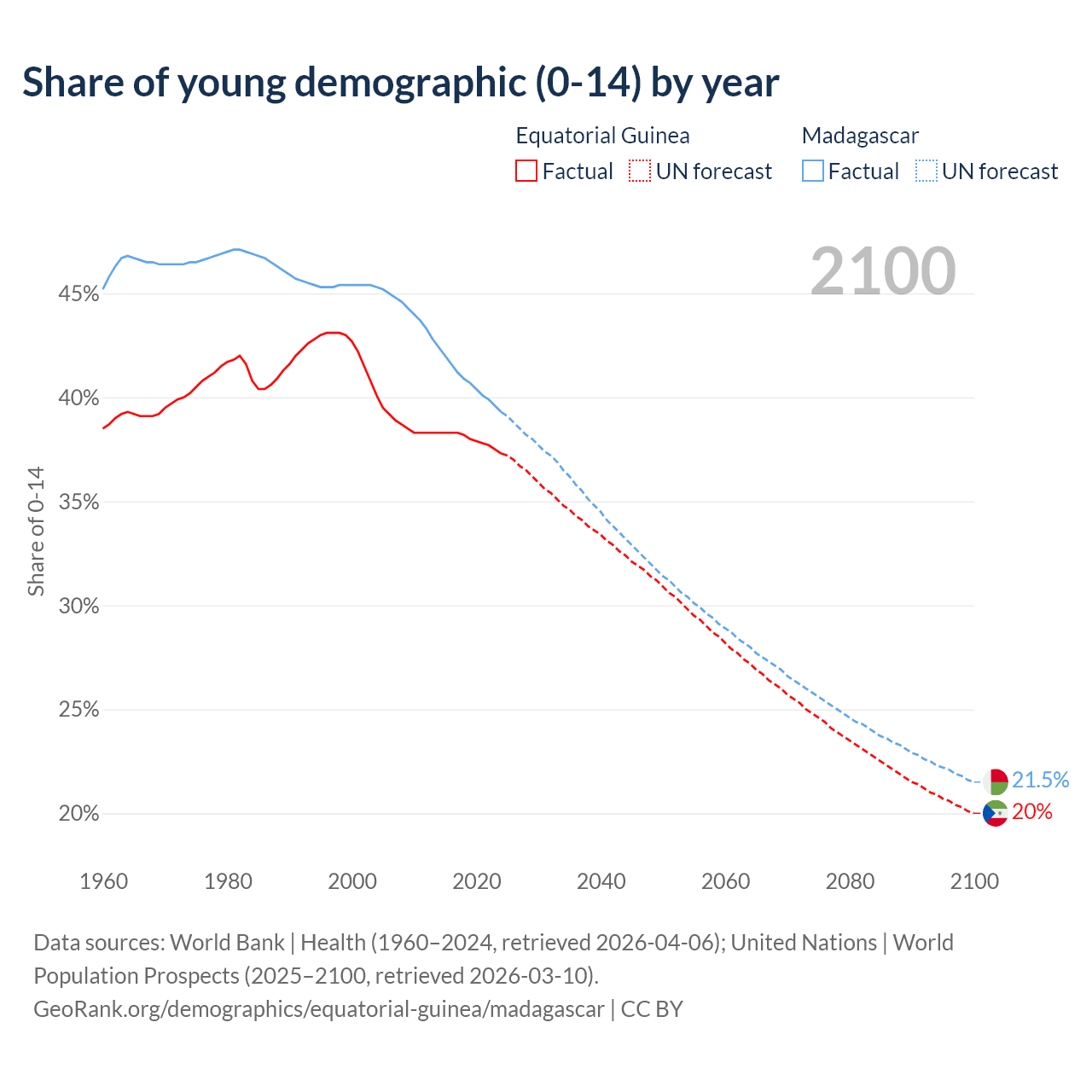 - The share of young demographic (0-15 years old) in Equatorial Guinea is 37.3% vs 39.3% in Madagascar.