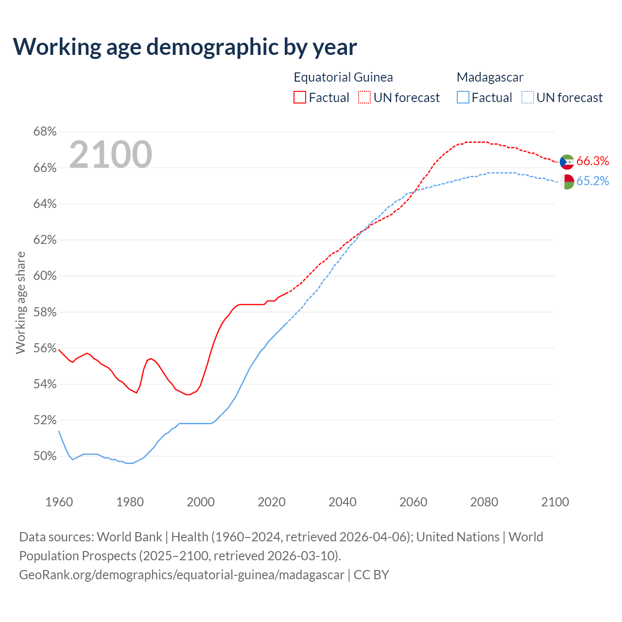 - Equatorial Guinea has 1.18M working age adults (aged 15-64) vs 19.4M in Madagascar.