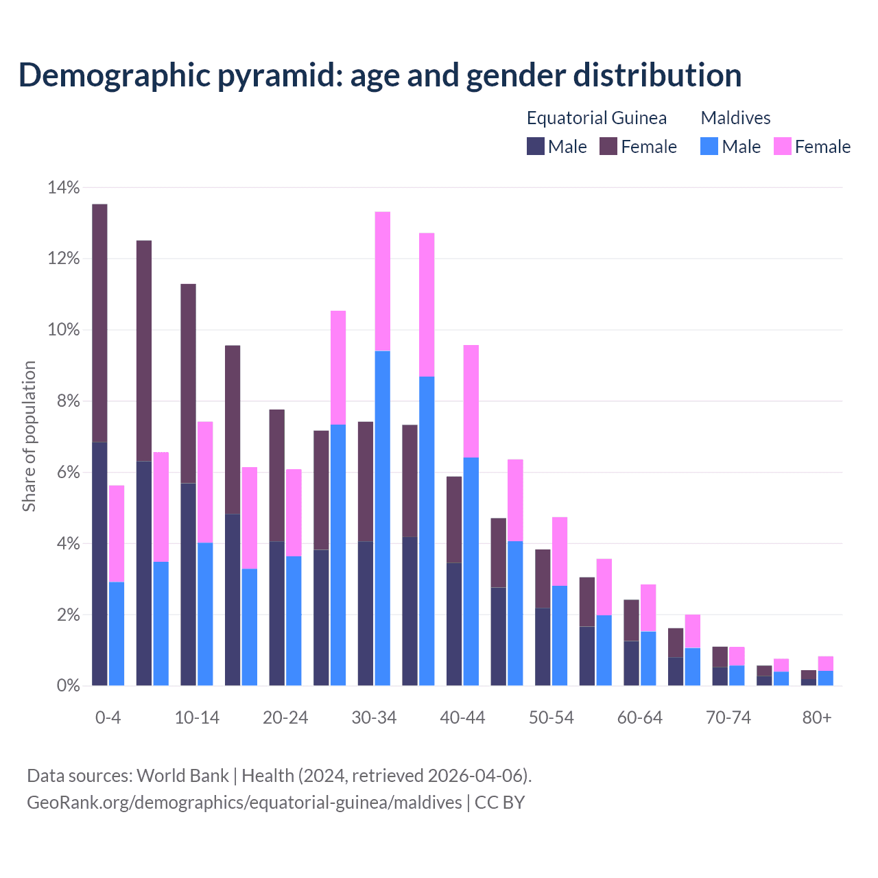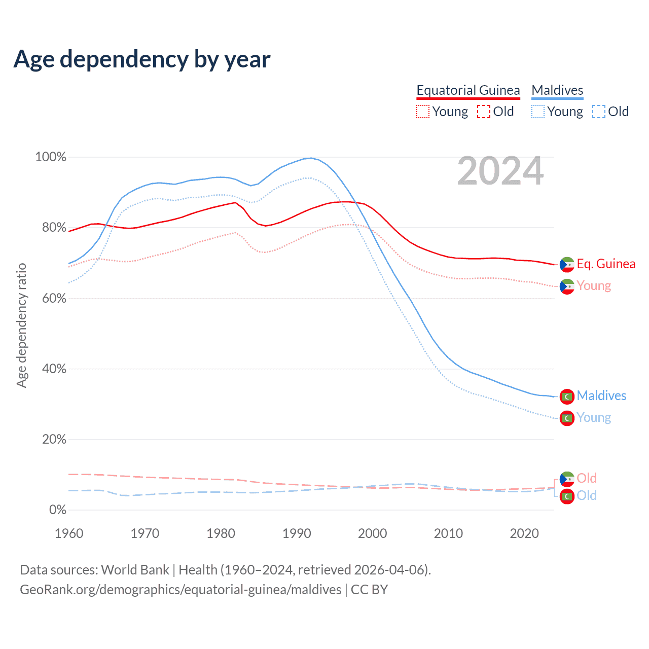 - The share of young demographic (0-15 years old) in Equatorial Guinea is 37.3% vs 19.6% in Maldives.