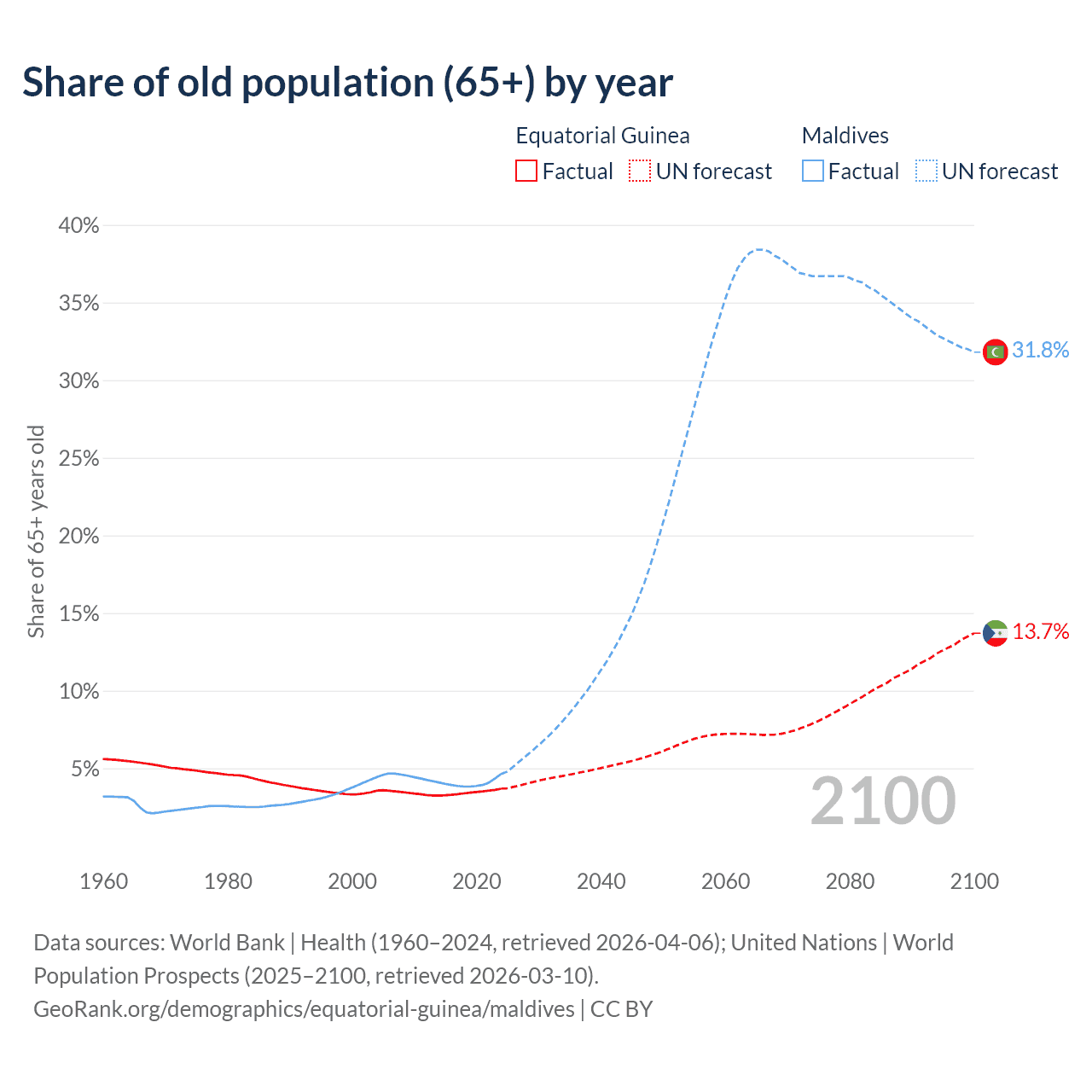 - The share of old-age demographic (65+) in Equatorial Guinea is 3.69% vs 4.64% in Maldives.