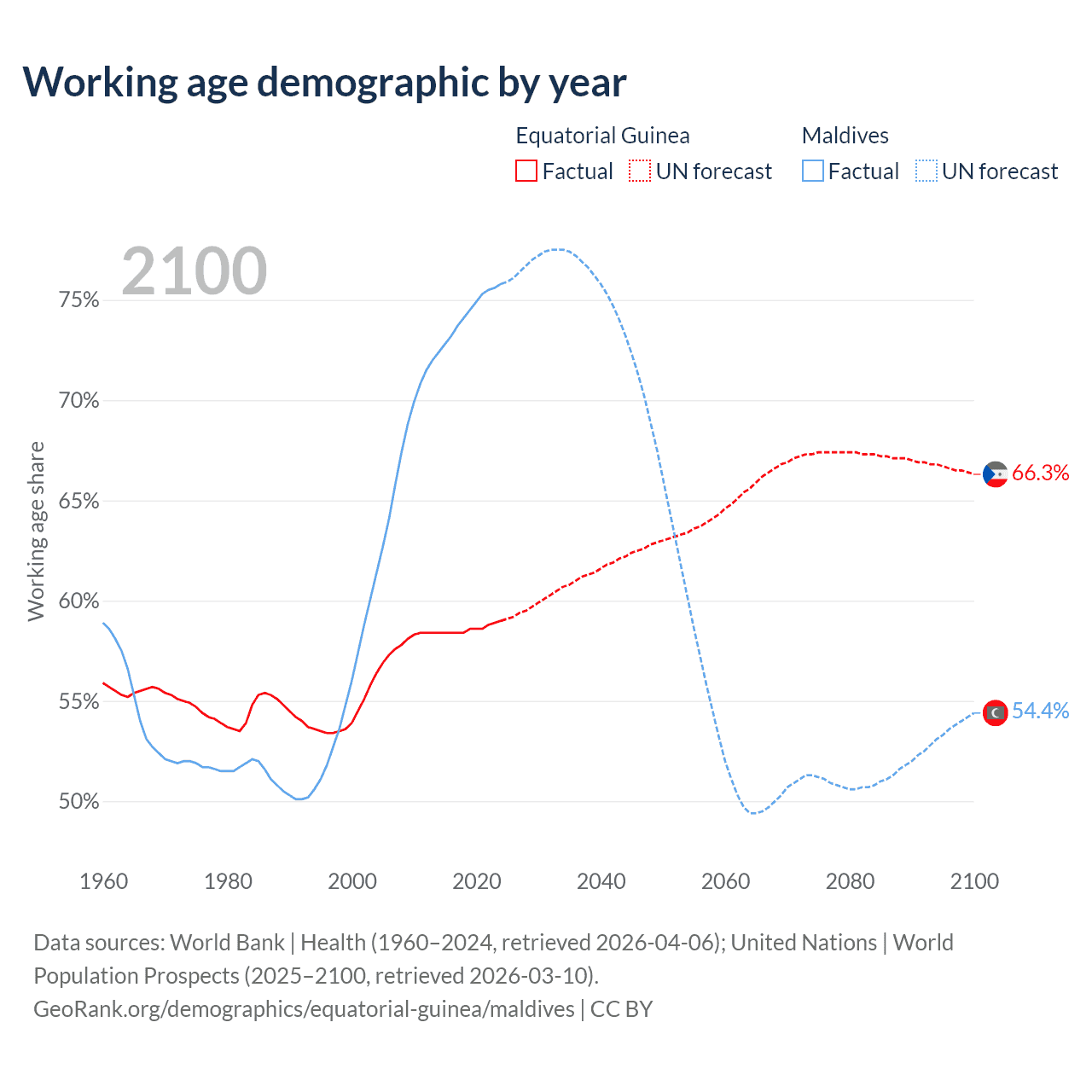 - Equatorial Guinea has 1.18M working age adults (aged 15-64) vs 403K in Maldives.