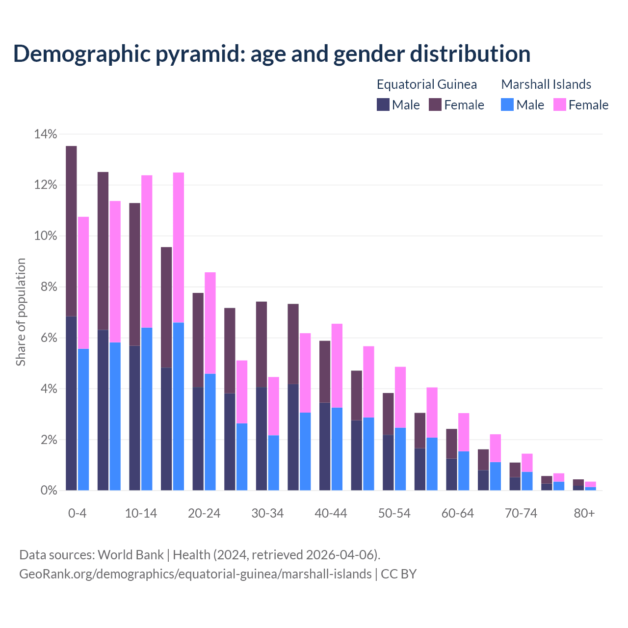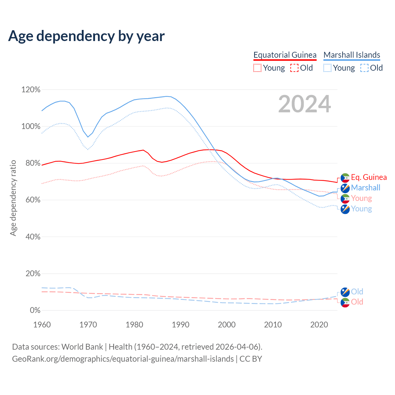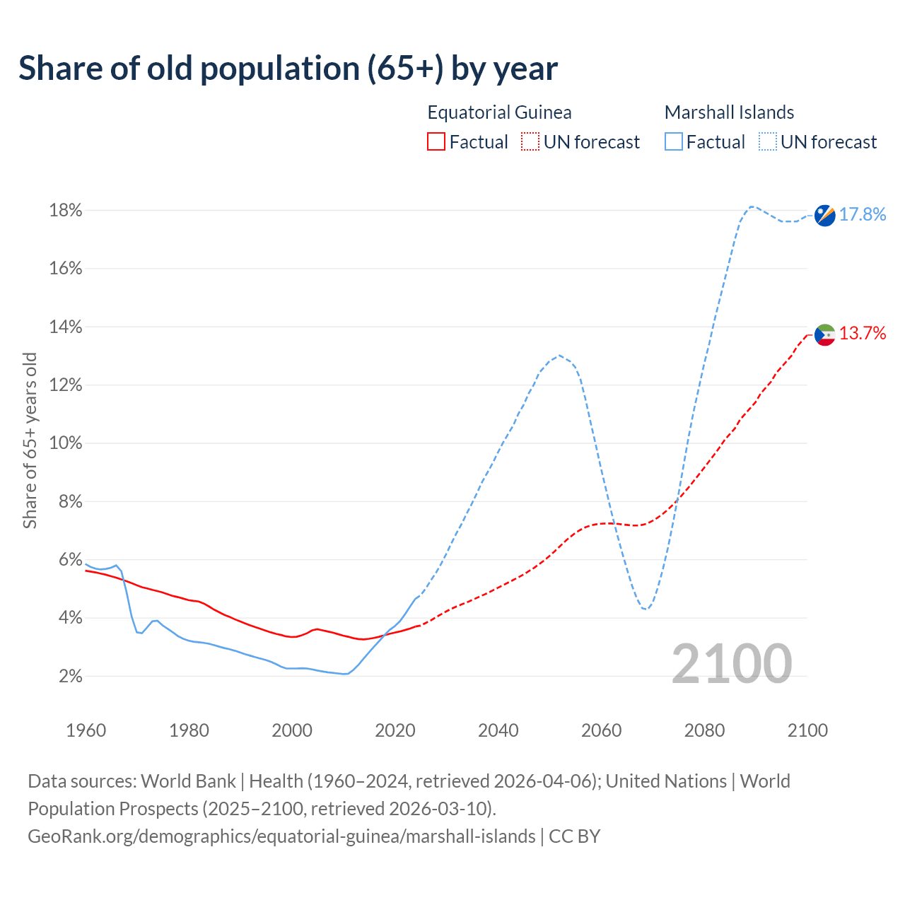 - The share of old-age demographic (65+) in Equatorial Guinea is 3.69% vs 4.64% in the Marshall Islands.
