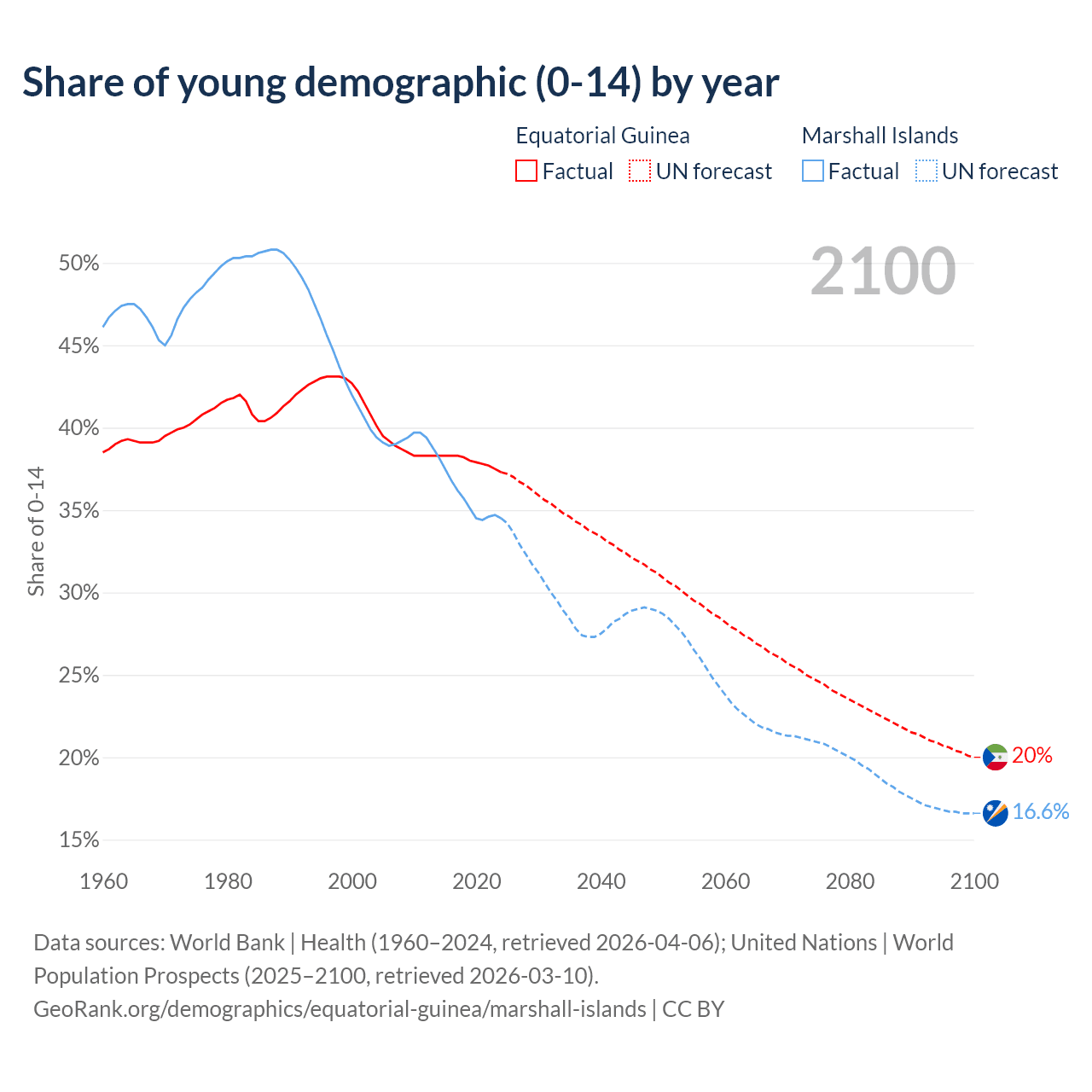 - The share of young demographic (0-15 years old) in Equatorial Guinea is 37.3% vs 34.5% in the Marshall Islands.