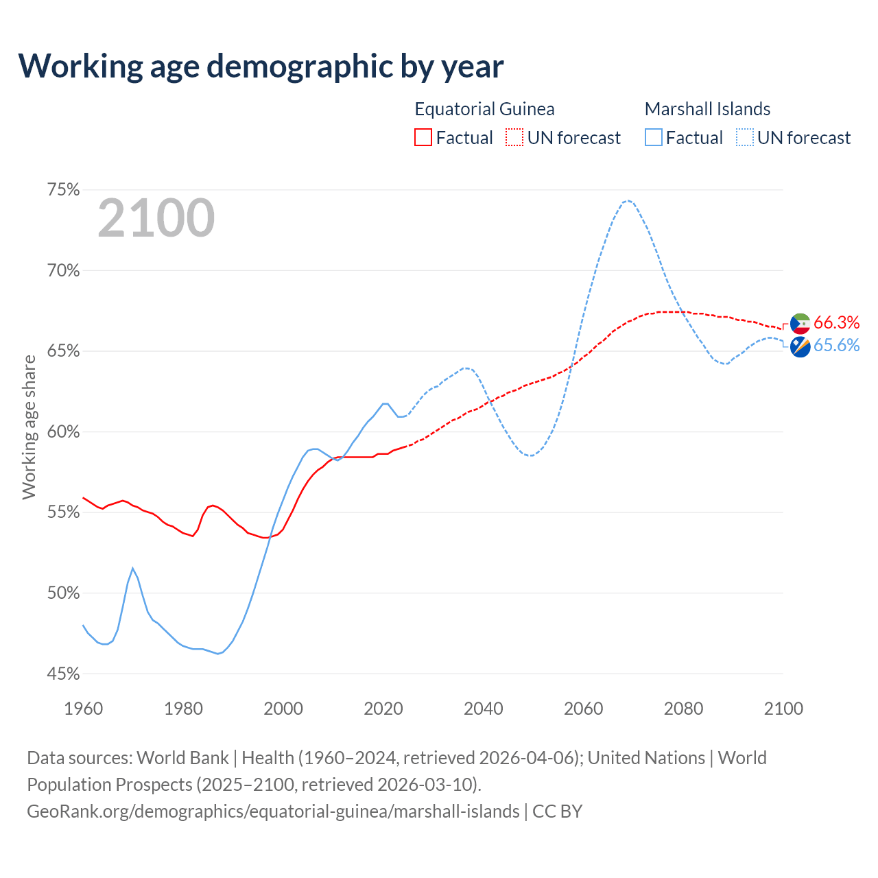 - Equatorial Guinea has 1.18M working age adults (aged 15-64) vs 21.3K in the Marshall Islands.