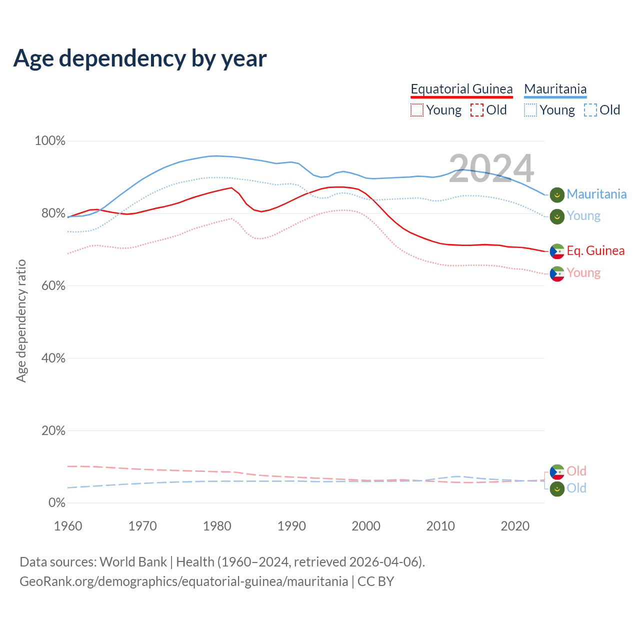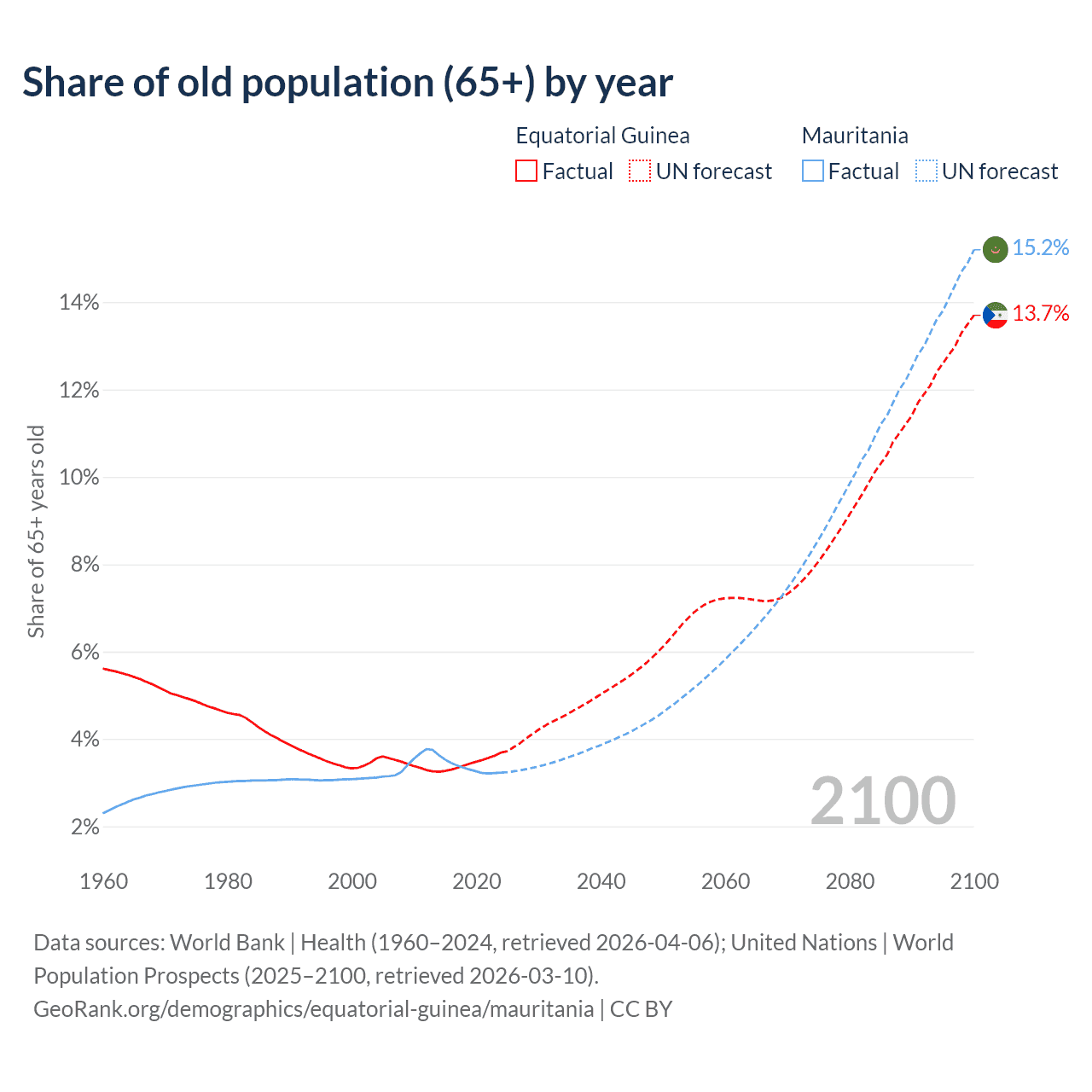 - The share of old-age demographic (65+) in Equatorial Guinea is 3.69% vs 3.23% in Mauritania.