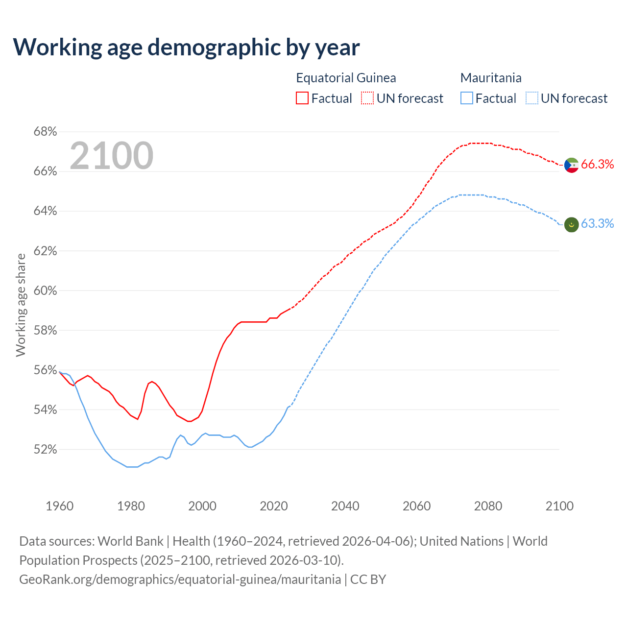 - Equatorial Guinea has 1.18M working age adults (aged 15-64) vs 2.98M in Mauritania.
