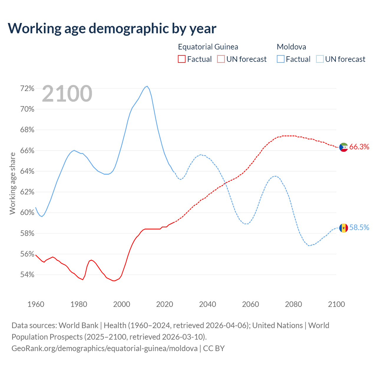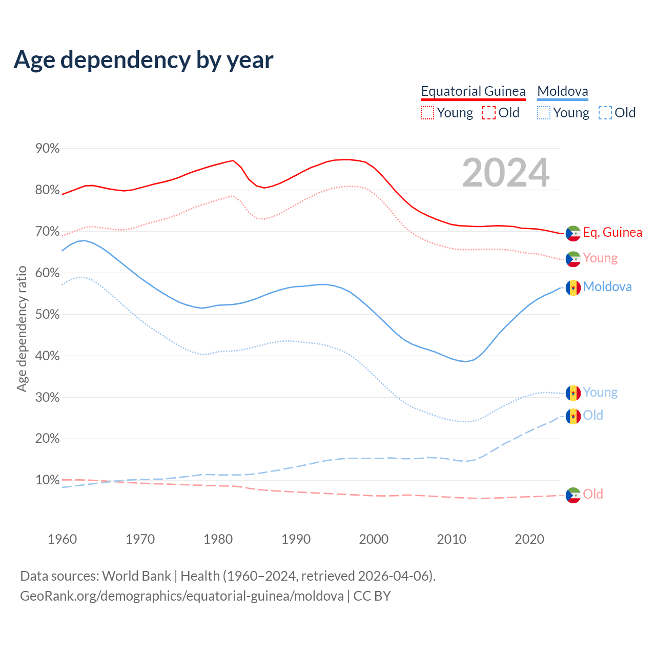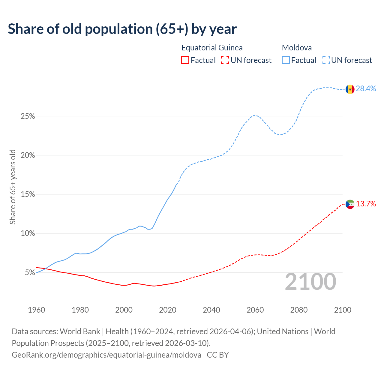 - The share of old-age demographic (65+) in Equatorial Guinea is 3.69% vs 16.2% in Moldova.