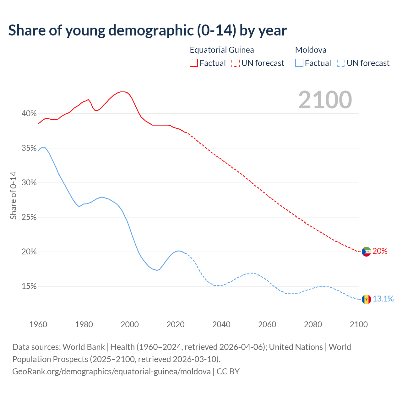 - The share of young demographic (0-15 years old) in Equatorial Guinea is 37.3% vs 19.8% in Moldova.