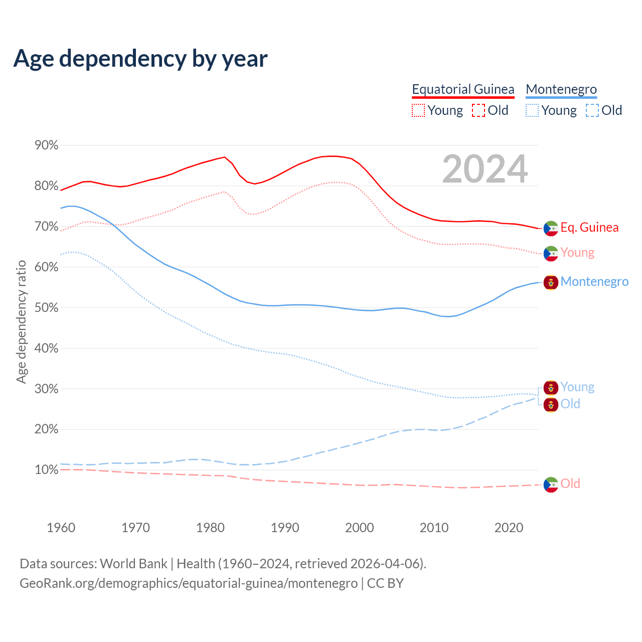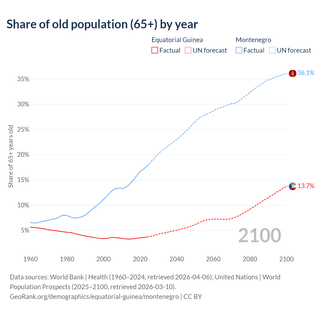 - The share of old-age demographic (65+) in Equatorial Guinea is 3.69% vs 17.8% in Montenegro.