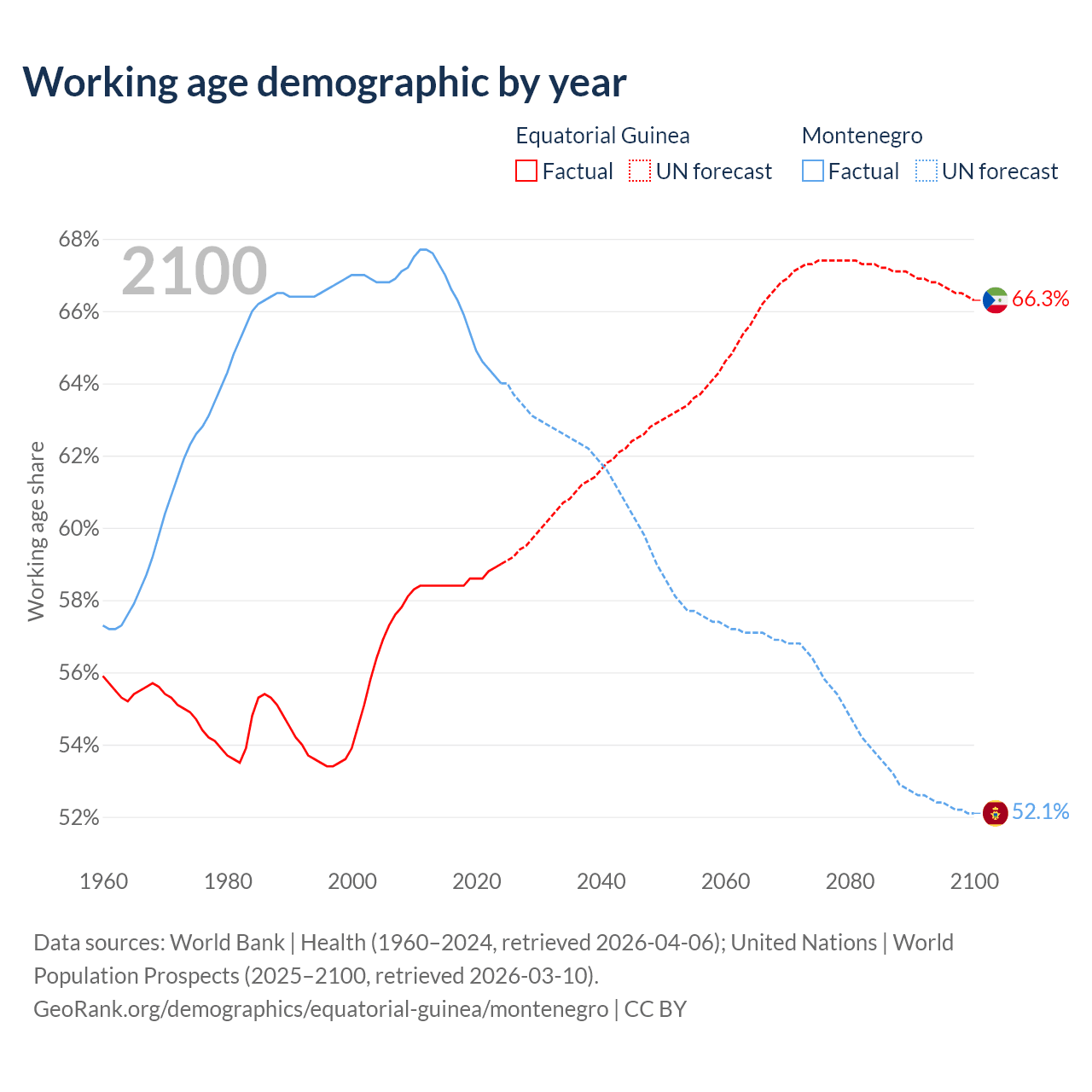- Equatorial Guinea has 1.18M working age adults (aged 15-64) vs 392K in Montenegro.