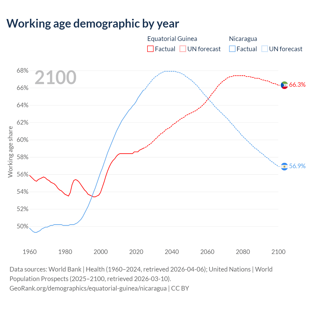- Equatorial Guinea has 1.18M working age adults (aged 15-64) vs 4.68M in Nicaragua.
