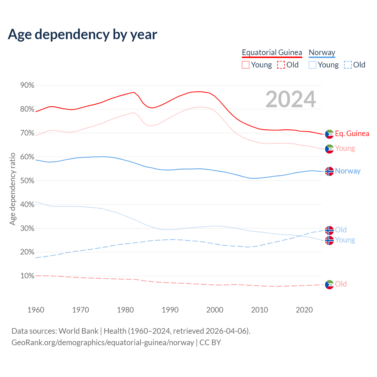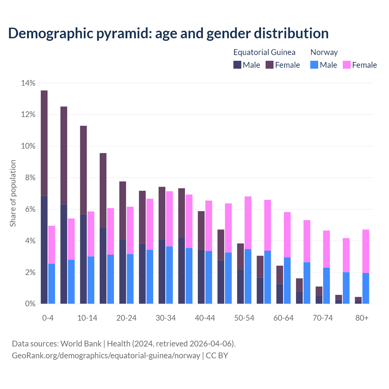 - The share of old-age demographic (65+) in Equatorial Guinea is 3.69% vs 18.8% in Norway.