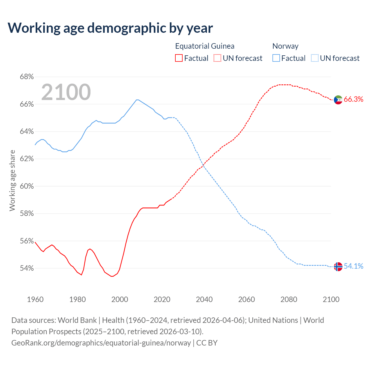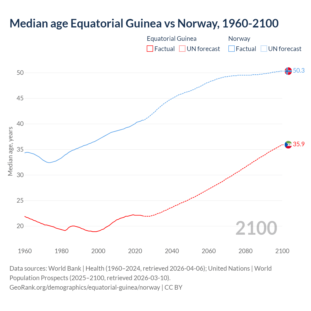 Median age Equatorial Guinea vs Norway, 1960-2100