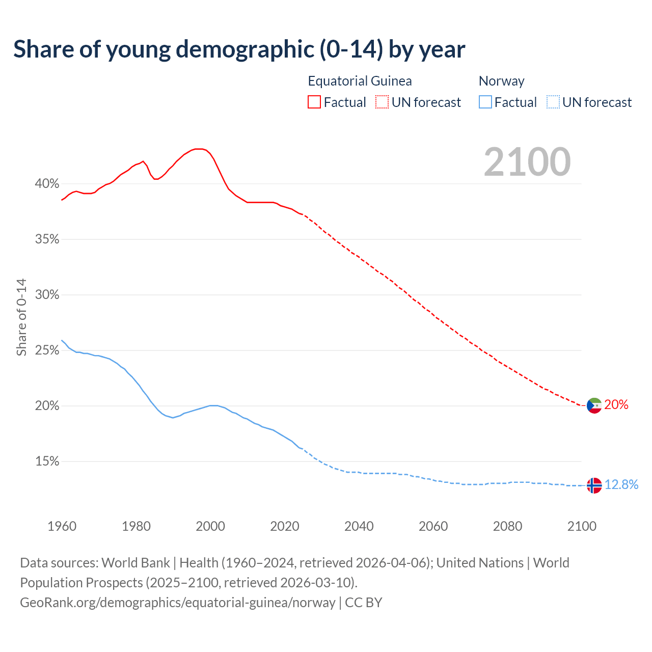 - The share of young demographic (0-15 years old) in Equatorial Guinea is 37.3% vs 16.2% in Norway.