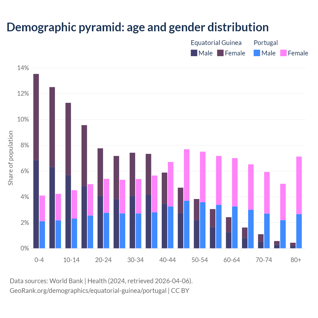 - The share of old-age demographic (65+) in Equatorial Guinea is 3.69% vs 24.5% in Portugal.