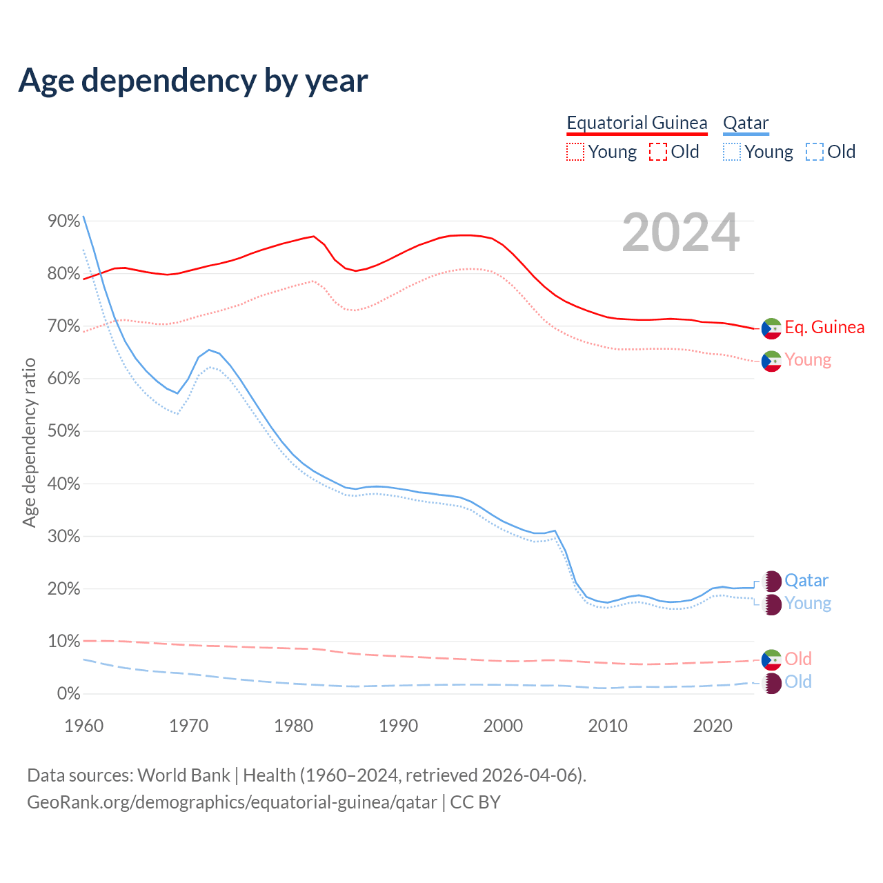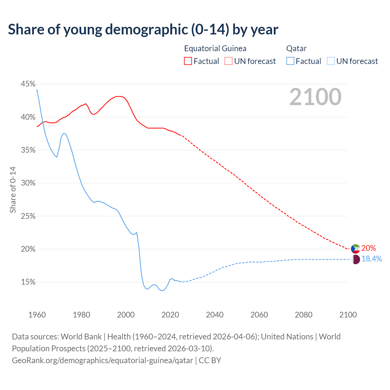- The share of young demographic (0-15 years old) in Equatorial Guinea is 37.3% vs 15.1% in Qatar.