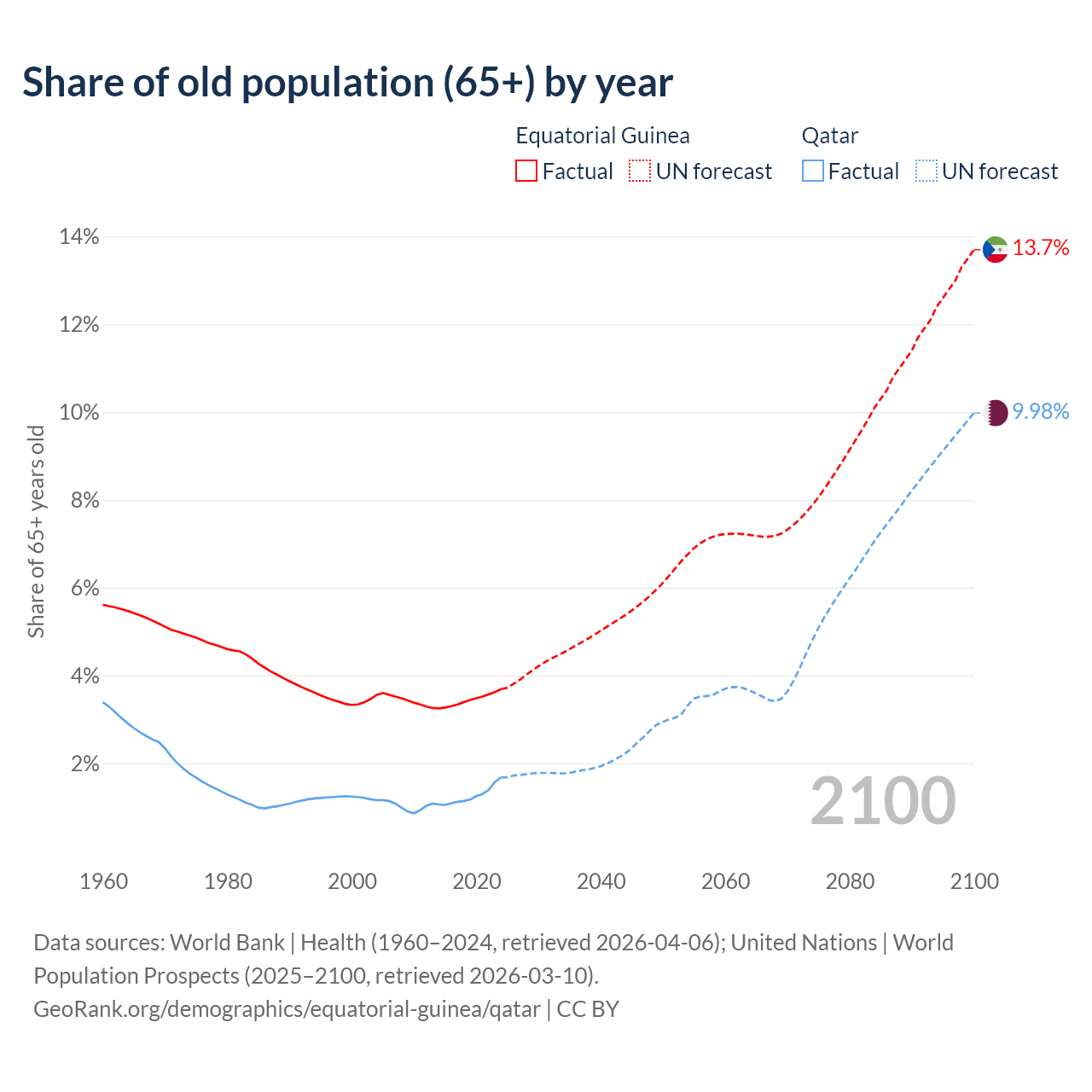 - The share of old-age demographic (65+) in Equatorial Guinea is 3.69% vs 1.68% in Qatar.