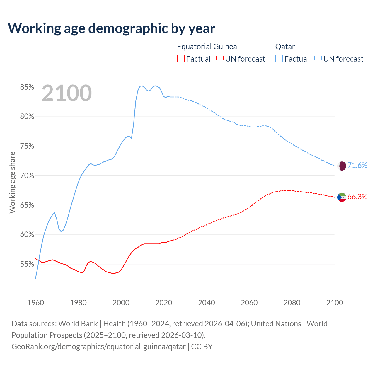 - Equatorial Guinea has 1.18M working age adults (aged 15-64) vs 2.5M in Qatar.
