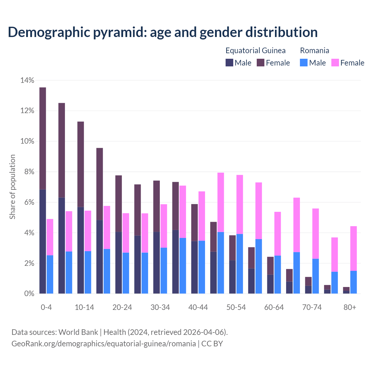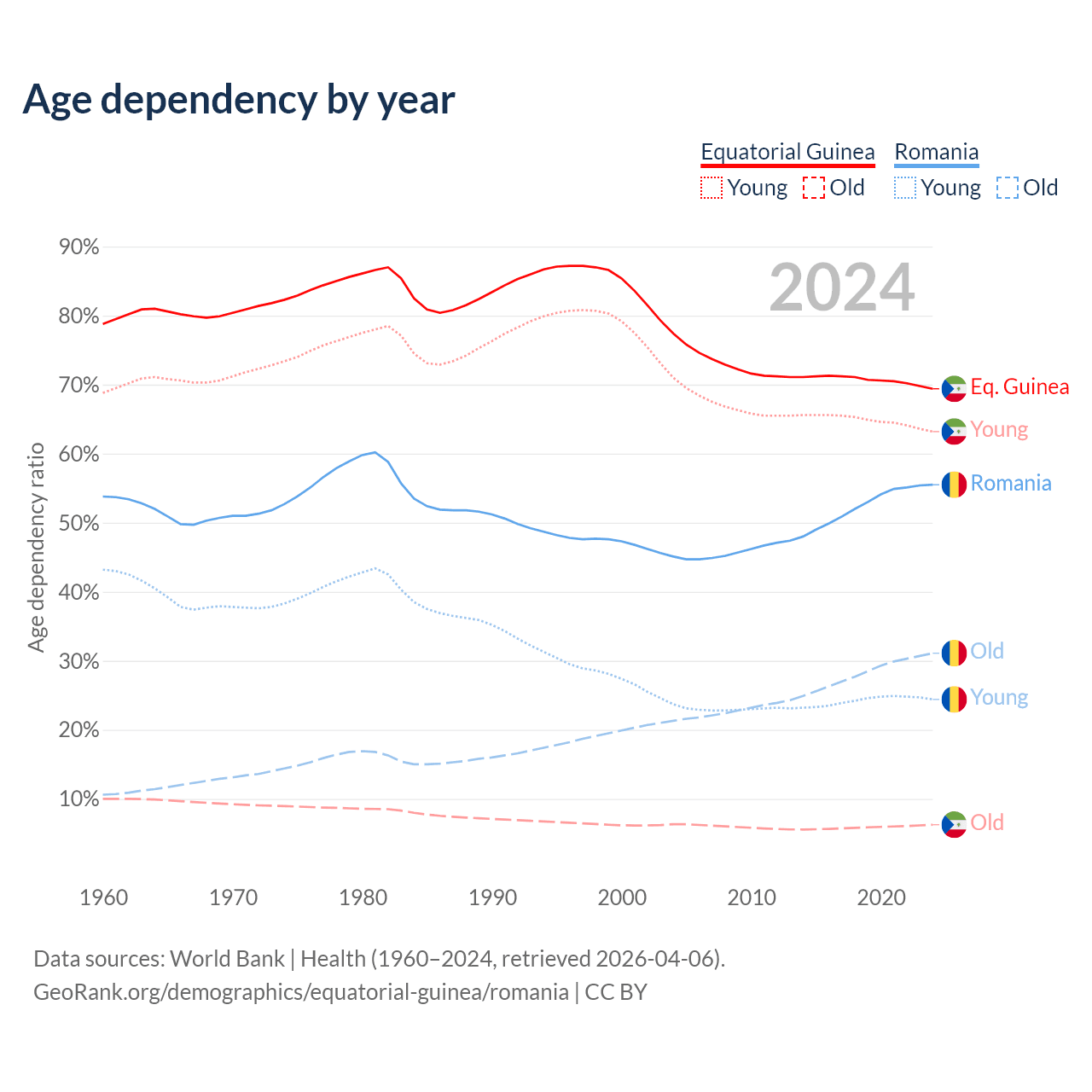 - The share of old-age demographic (65+) in Equatorial Guinea is 3.69% vs 20% in Romania.