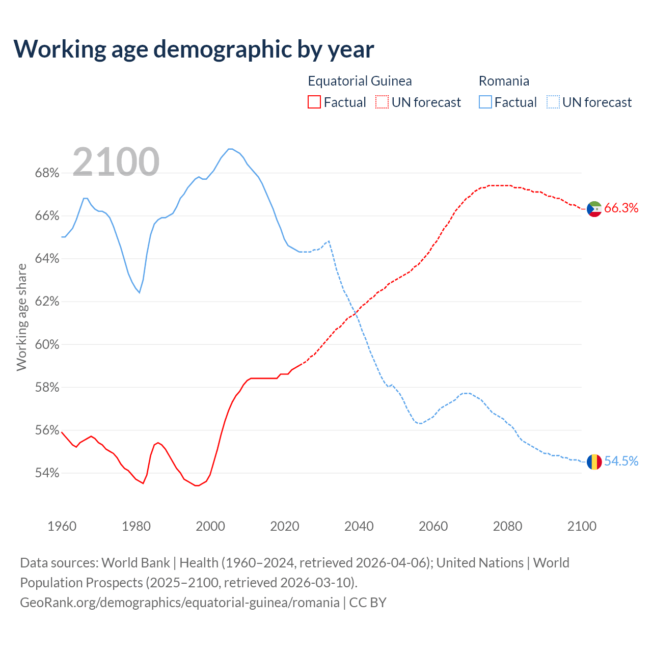 Median age Equatorial Guinea vs Romania, 1960-2100
