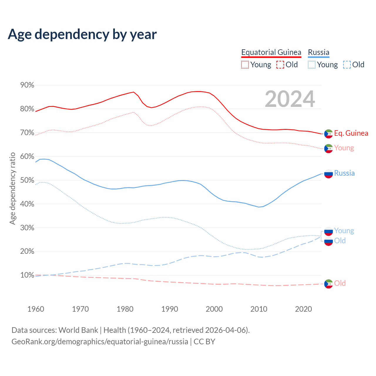 - The share of old-age demographic (65+) in Equatorial Guinea is 3.69% vs 17.2% in Russia.
