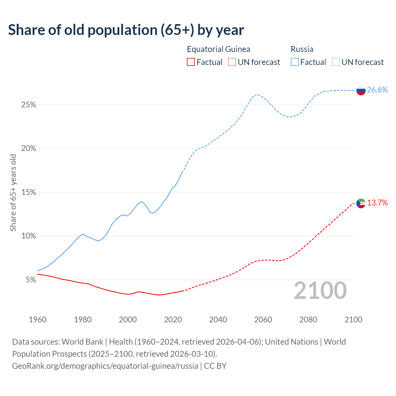 The share of older people aged 65 and over is 3.69% in Equatorial Guinea and 17.2% in Russia. Life expectancy in Equatorial Guinea compared to Russia .