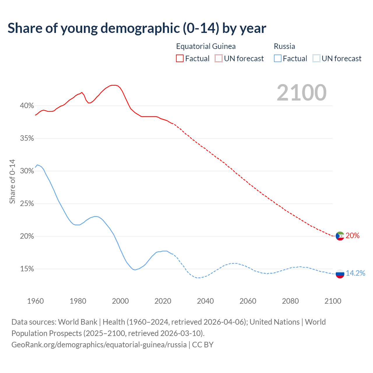- The share of young demographic (0-15 years old) in Equatorial Guinea is 37.3% vs 17.3% in Russia.