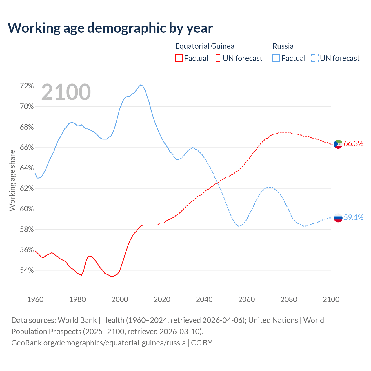 - Equatorial Guinea has 1.18M working age adults (aged 15-64) vs 93M in Russia.