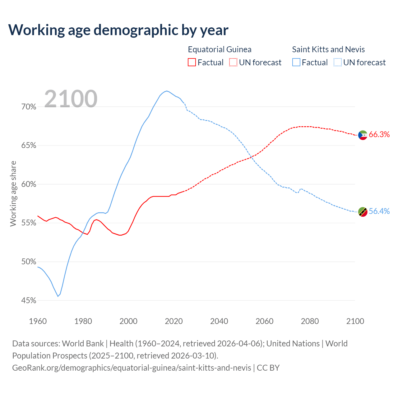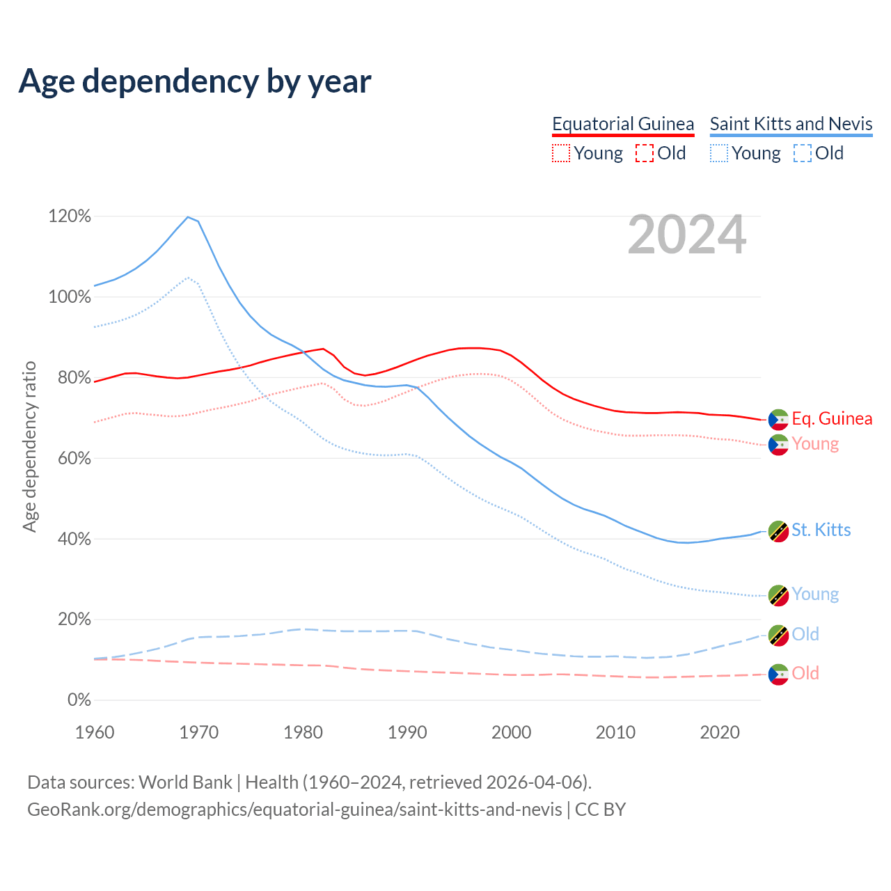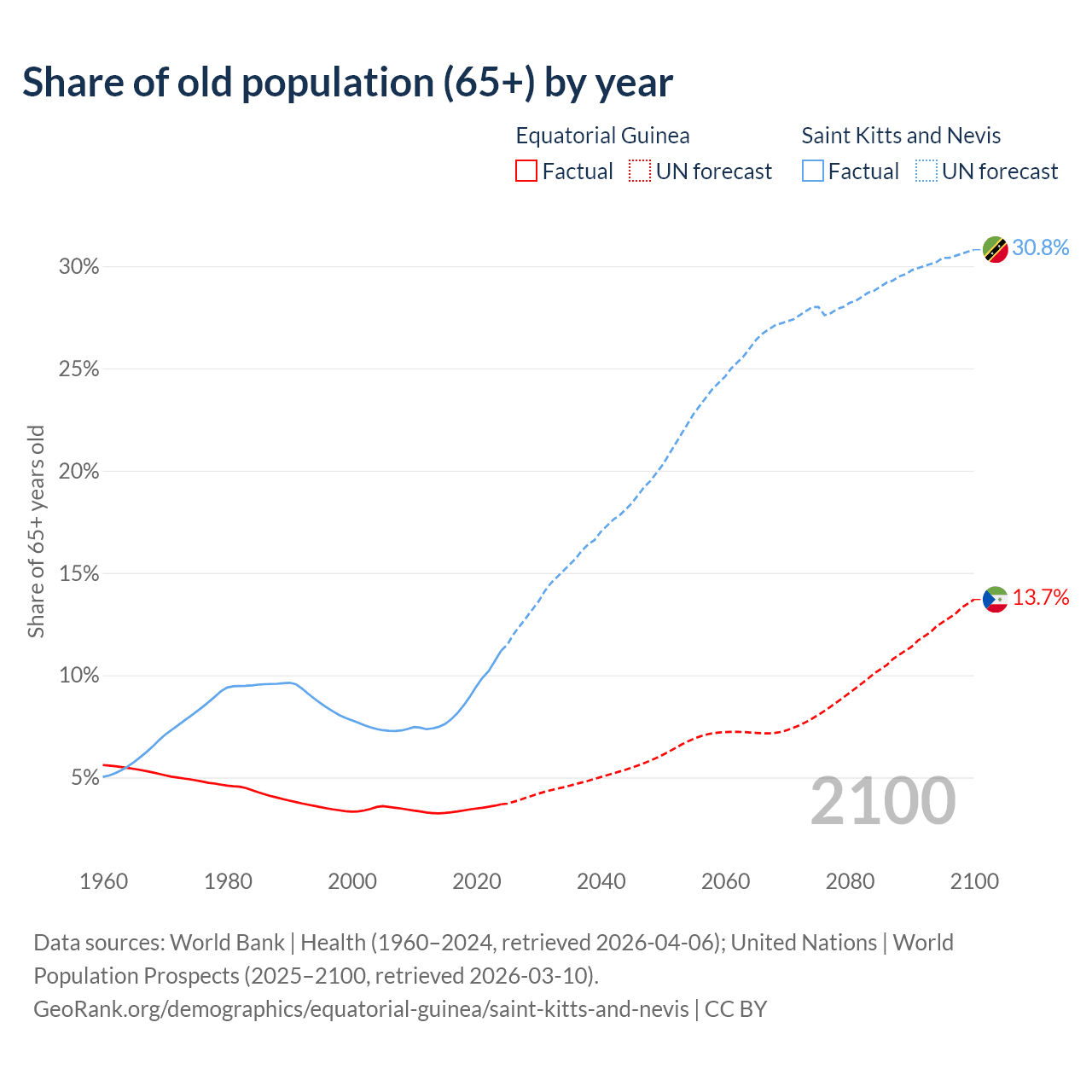 The share of older people aged 65 and over is 3.69% in Equatorial Guinea and 11.2% in Saint Kitts and Nevis. Life expectancy in Equatorial Guinea compared to Saint Kitts and Nevis .
