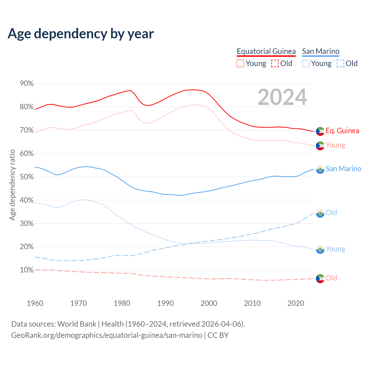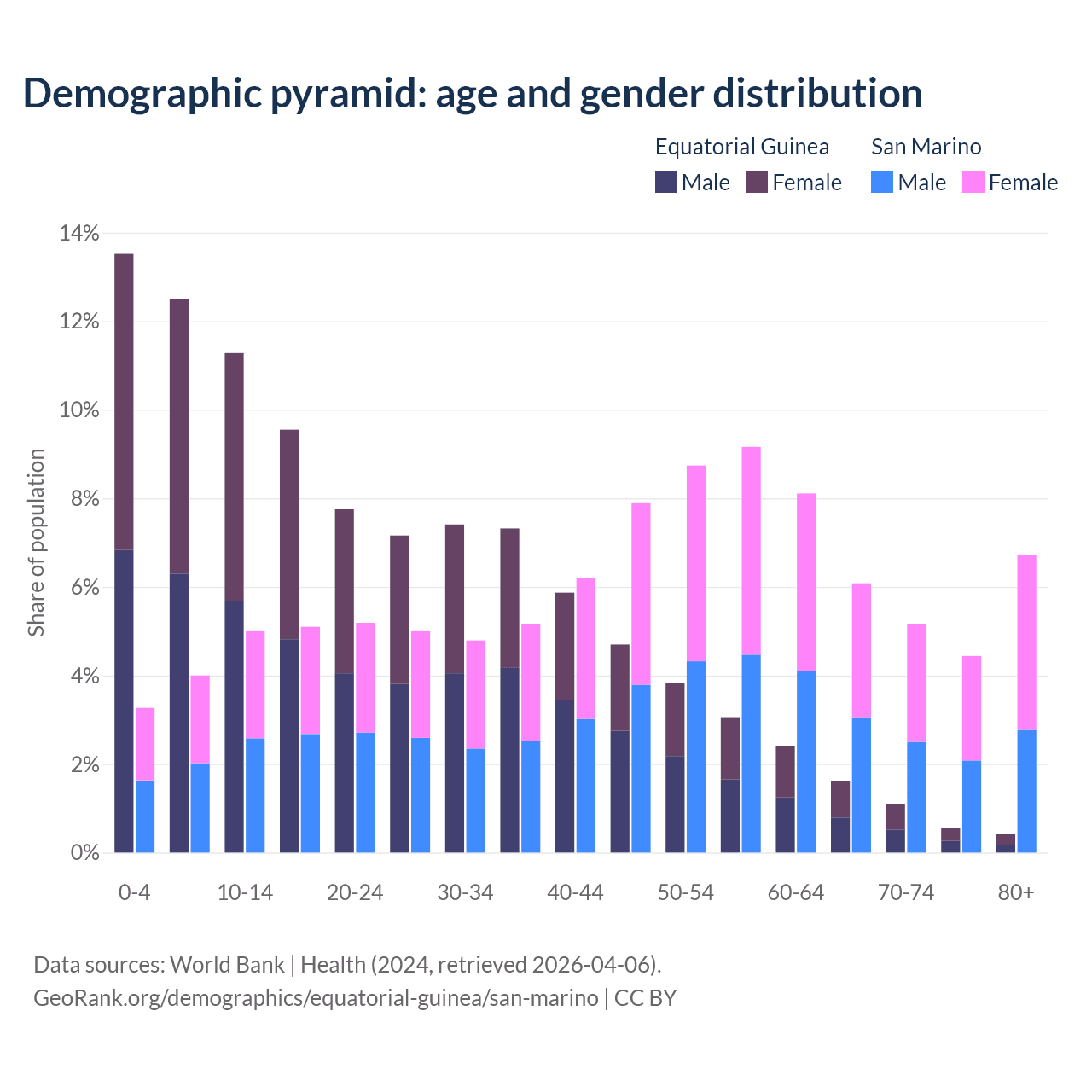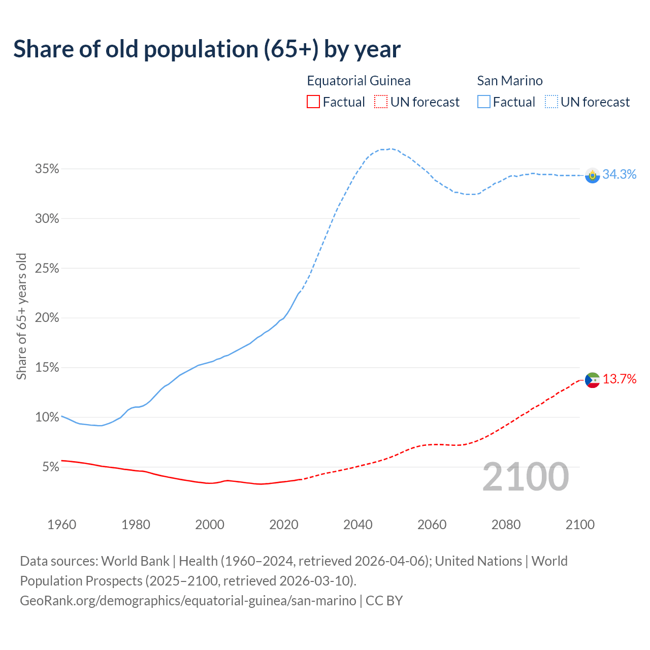 - The share of old-age demographic (65+) in Equatorial Guinea is 3.69% vs 22.4% in San Marino.