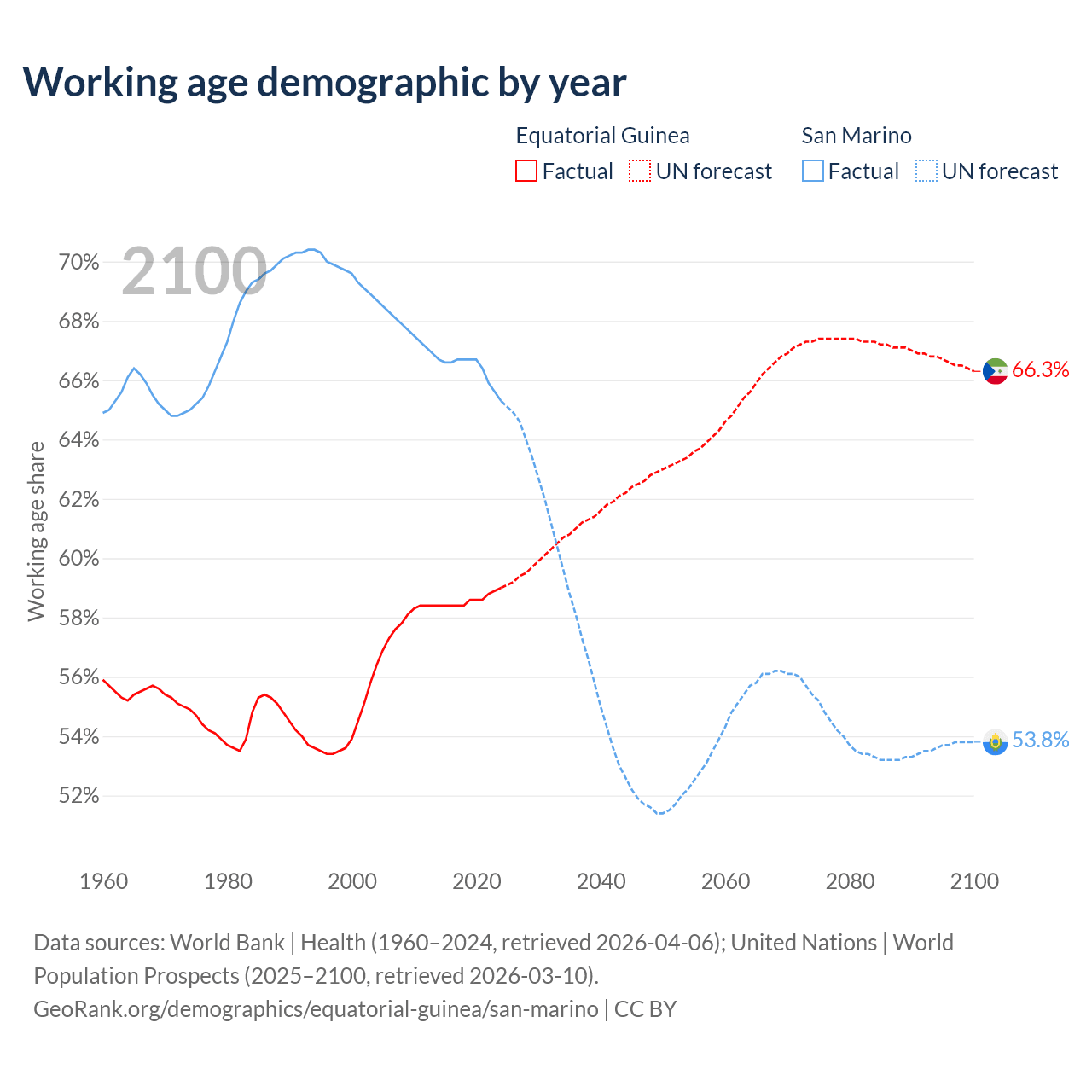 - Equatorial Guinea has 1.18M working age adults (aged 15-64) vs 22.2K in San Marino.