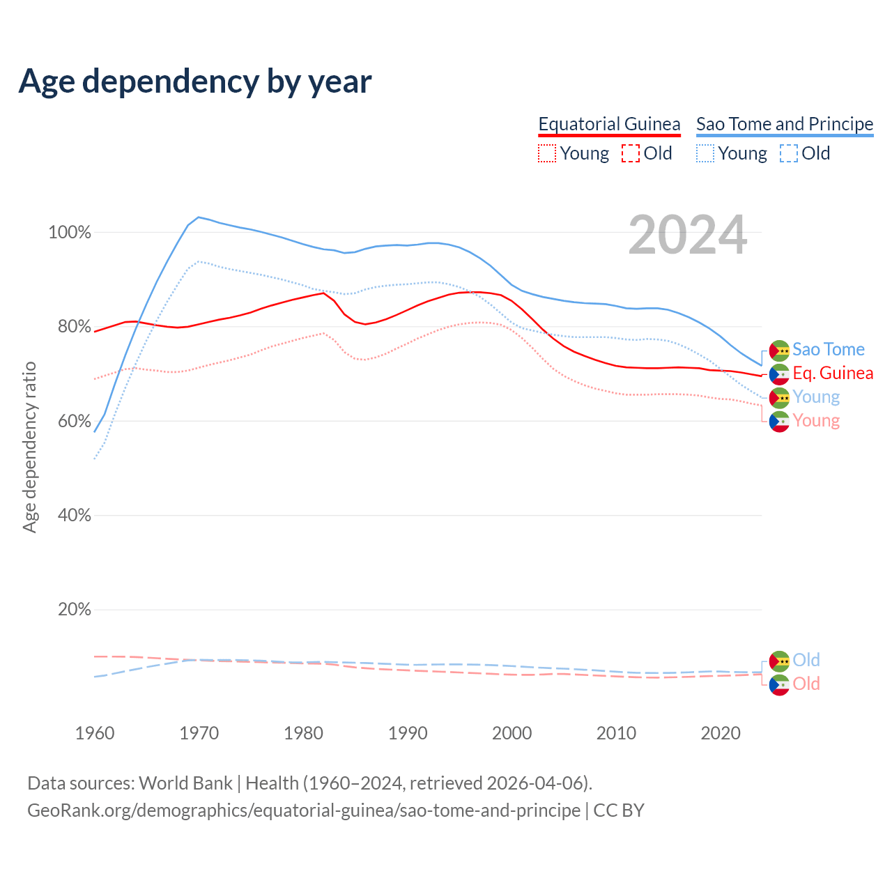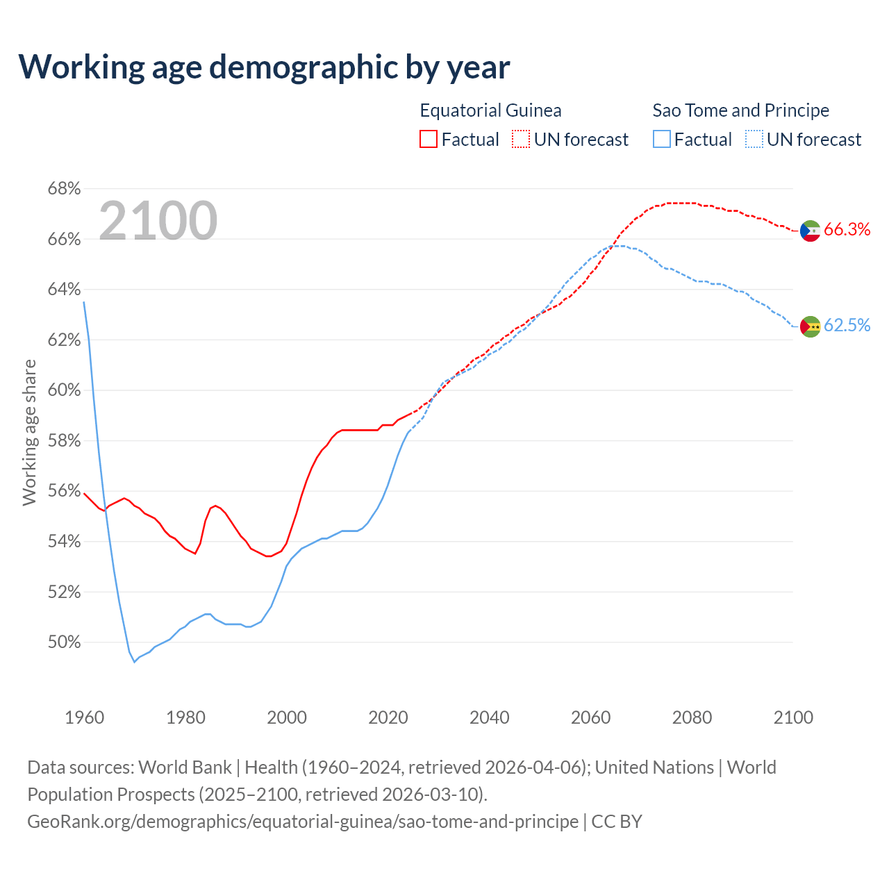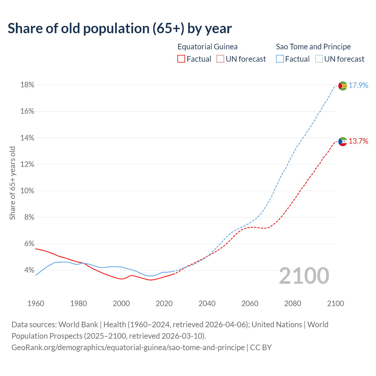 - The share of old-age demographic (65+) in Equatorial Guinea is 3.69% vs 3.9% in Sao Tome and Principe.